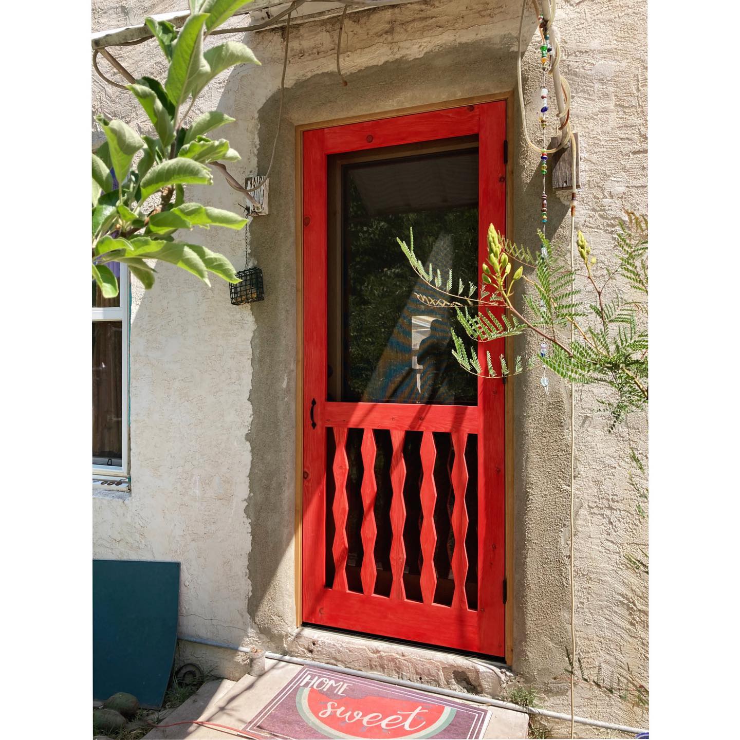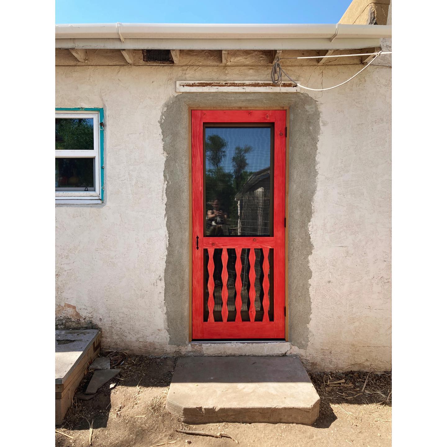 Two pairs of exterior and screen doors we built for a sweet little house in the South Valley undergoing renovations. The exterior doors are solid alder, with an @osmo_usa finish and lots of glazing to bring more natural light into the house. For the screen doors, we went with a traditional New Mexican zig-zag pattern, with a cherry red stain. The screen doors operate with a hydraulic closer. There’s a wonderful book — New Mexico Style: A Sourcebook of Traditional Architectural Details by Nancy Warren, published by @mnmpress — that we open up every time we have a new door project. The inspiration for the zig-zag motif came from here. Highly recommend this book for anyone with a love for New Mexico architecture. #screendoor #customdoors #alderwood #newmexicostyle #southvalleyabq #abqcontractor