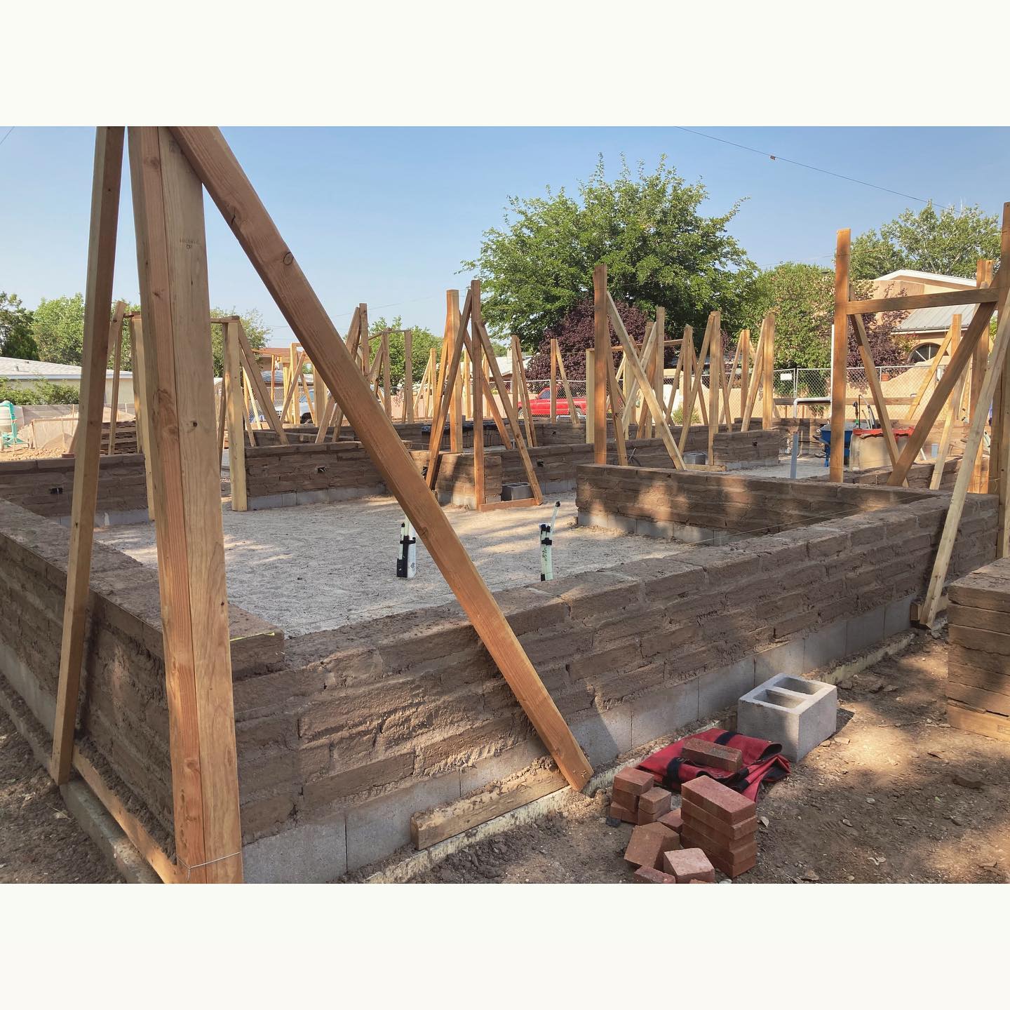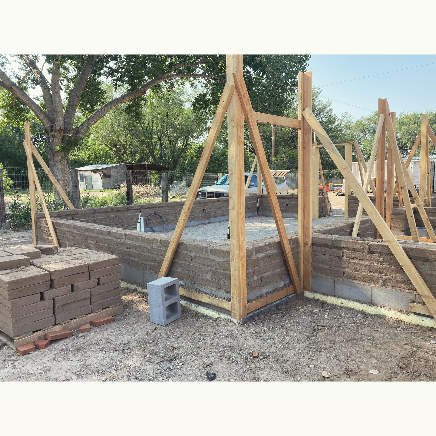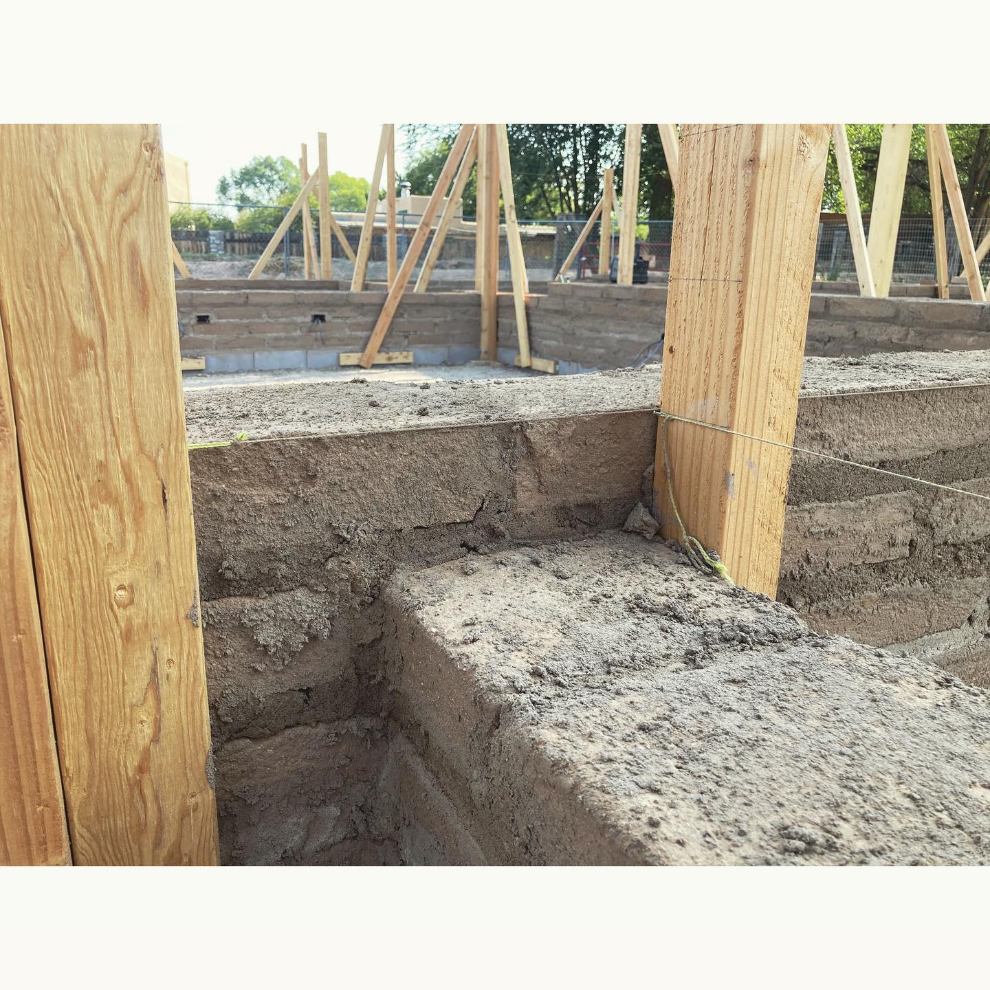 This house is moving along, one adobe at a time! One of the beautiful things about adobe is what a forgiving and patient material it is. There are just a few simple rules to follow for laying the adobe bricks (use enough mud, stay level and plumb with the string, lap all your joints), and if you happen to forget the rules for a moment, you can probably correct it the next time you come around. When the day is done, any mortar leftover in the mixer can be covered and saved for tomorrow. Of course, the prep work is what makes that whole process go smoothly. At each corner there is a braced “story pole” from which to stretch a string. Every course of adobe, window sill, lintel, and the bond beam (literally, the “story” that each course of adobe follows) is established with the transit, and marked out on the poles with a nail to hold the string. This lumber will all be reused later when we frame the roof, so rather than hammering the nails in, we pre-drilled holes to make the nail a moveable peg. It’s helpful to do as much of the “thinking work” as possible before you start laying, because laying adobes is dead tiring work. Each brick weighs about 30 pounds. With adobe, the string line gives you your point of reference, so you don’t need to carry a level or trowel, or be constantly checking anything. Compared to other types of masonry, adobe has a greater amount of tolerable variation (the bricks can vary plus or minus 1/2″ in thickness). Horizontal runs of electrical wires are buried directly in the mud, and notches cut out of the adobes for the electrical boxes, which are laid on their sides. Vertical electrical runs will be channeled out later. This is a very different process from wiring a frame house, so it’s helpful to have an electrician who is familiar with adobe and can plan ahead. We have 19 courses of adobe to reach the bond beam, with the first window bucks going in after the 5th course. It’s such a pleasure to walk around inside the house and begin to visualize it, now that we’ve gone vertical.