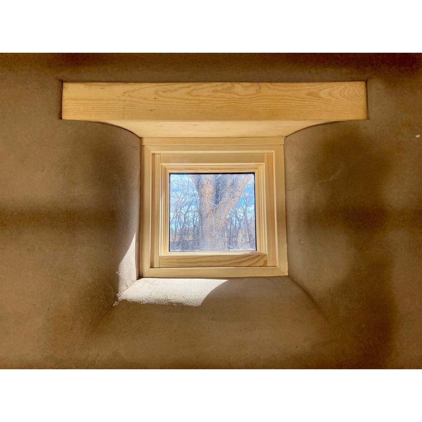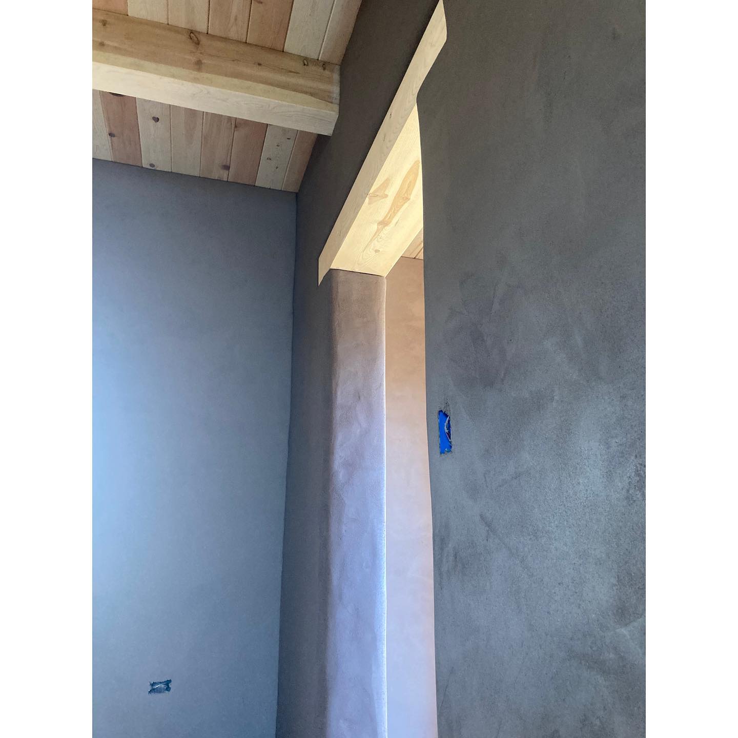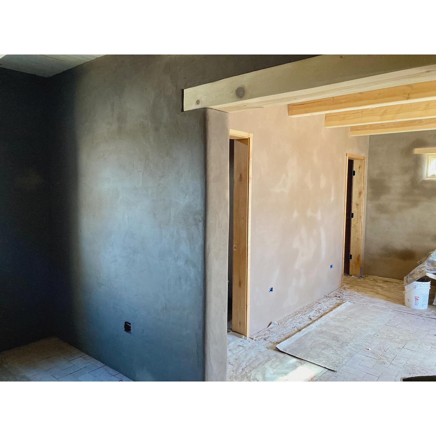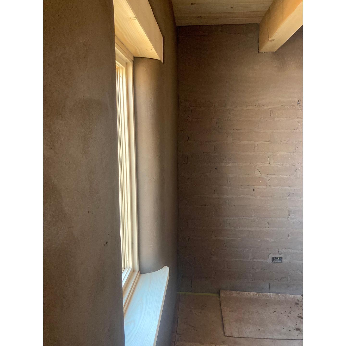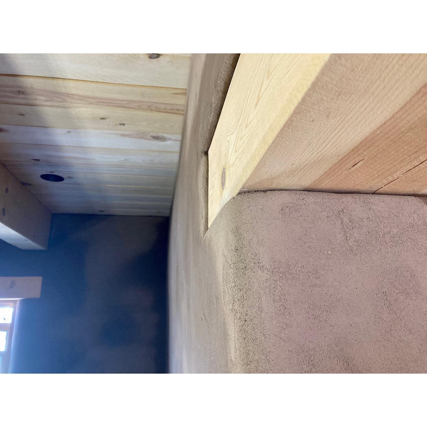 As on most projects we’ve done, we’re covering these dirt walls with… more dirt. This is a modestly sized house, and yet it has almost 4,000 square feet of surface to dress up, in addition to a bunch of windows and doors that all need careful detailing, and beams that need cleaning as we go. That’s not much square footage really, but it’s enough that we need a solid grasp of the level of finish required and how much work it takes to get there. We must consider the fact that we’re a small company with limited man and woman power, that we have a budget and timeline to be mindful of. We also need to be mindful of the *kind* of building we’re working on: the thing is made of dirt, and has walls that, while built true and plumb, are not flat. With all this in mind, this is how we do it: The adobe walls all get rasped to bring the odd 11″ trapezoidal adobe roughly back into line with its neighbors. We do this to make sure the wall doesn’t have “too much” topography, and to reduce cracking in our plaster. Except for at windows and over the bond beam, where we do a scratch coat of gypsum or mud, the entire wall gets just a single coat of earth plaster. This is the same dirt we used to lay the adobes, just with more sand. Before we begin, we do a couple samples of different ratios of sand and dirt to see how it works on the wall. Once these have dried, we know what our what our mix is and can get to work. Because we do it all in a single coat, it is impossible to create a surface that is flawless in the same way a sanded sheetrock wall is “flawless.” Rather, our idea is to let the plaster follow the wall; all we’re doing to fairing out a whole bunch of jagged little shapes, softening and connecting them into a single rolling surface. On the frame walls, we used a slightly different mix, but are still really just covering everything in mud. This worked beautifully, and goes a long way toward giving these walls the same feel and texture as the masonry walls.