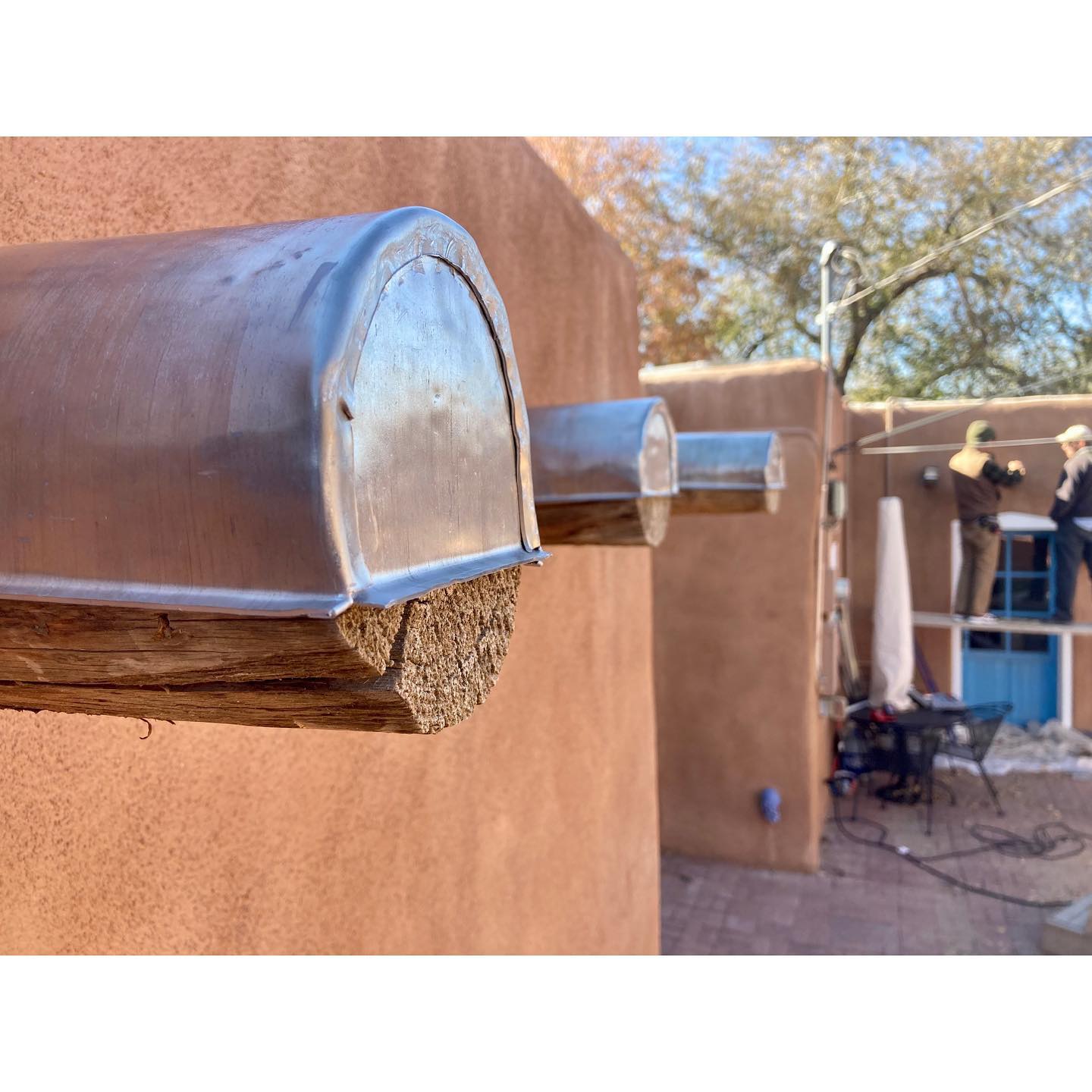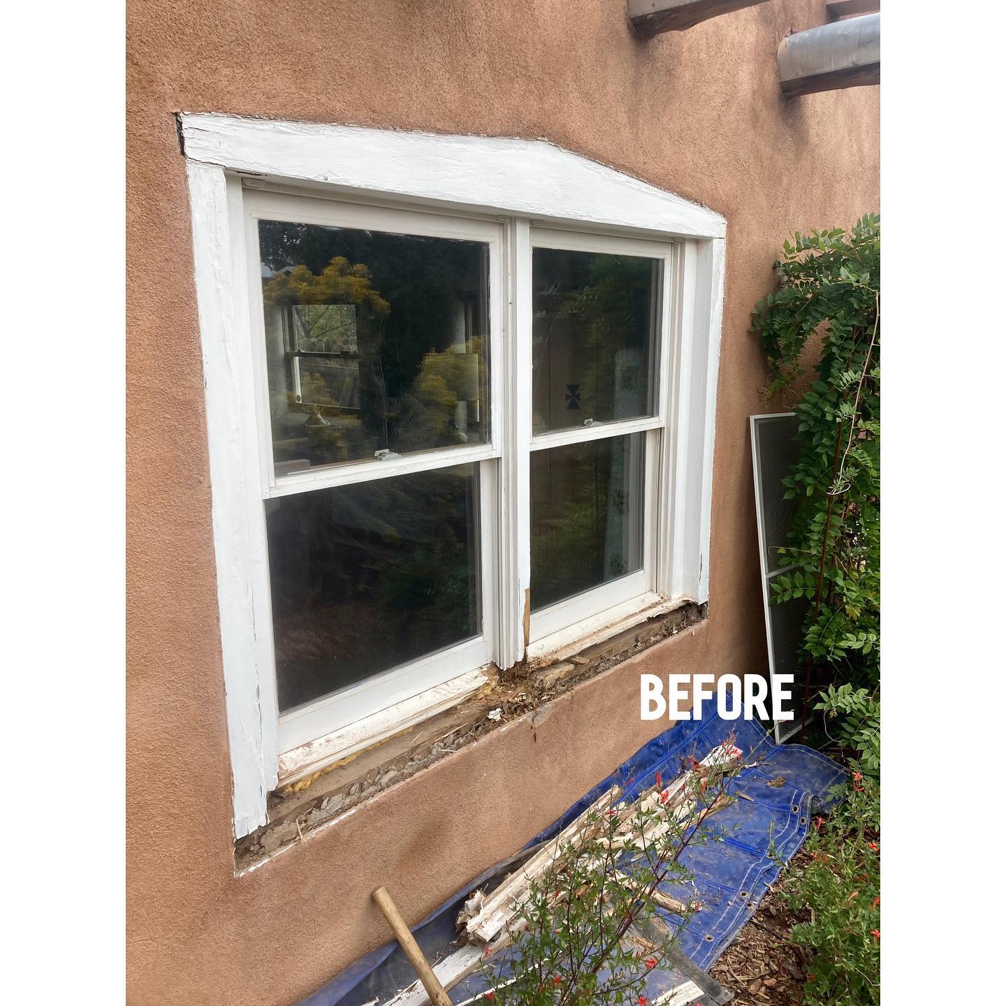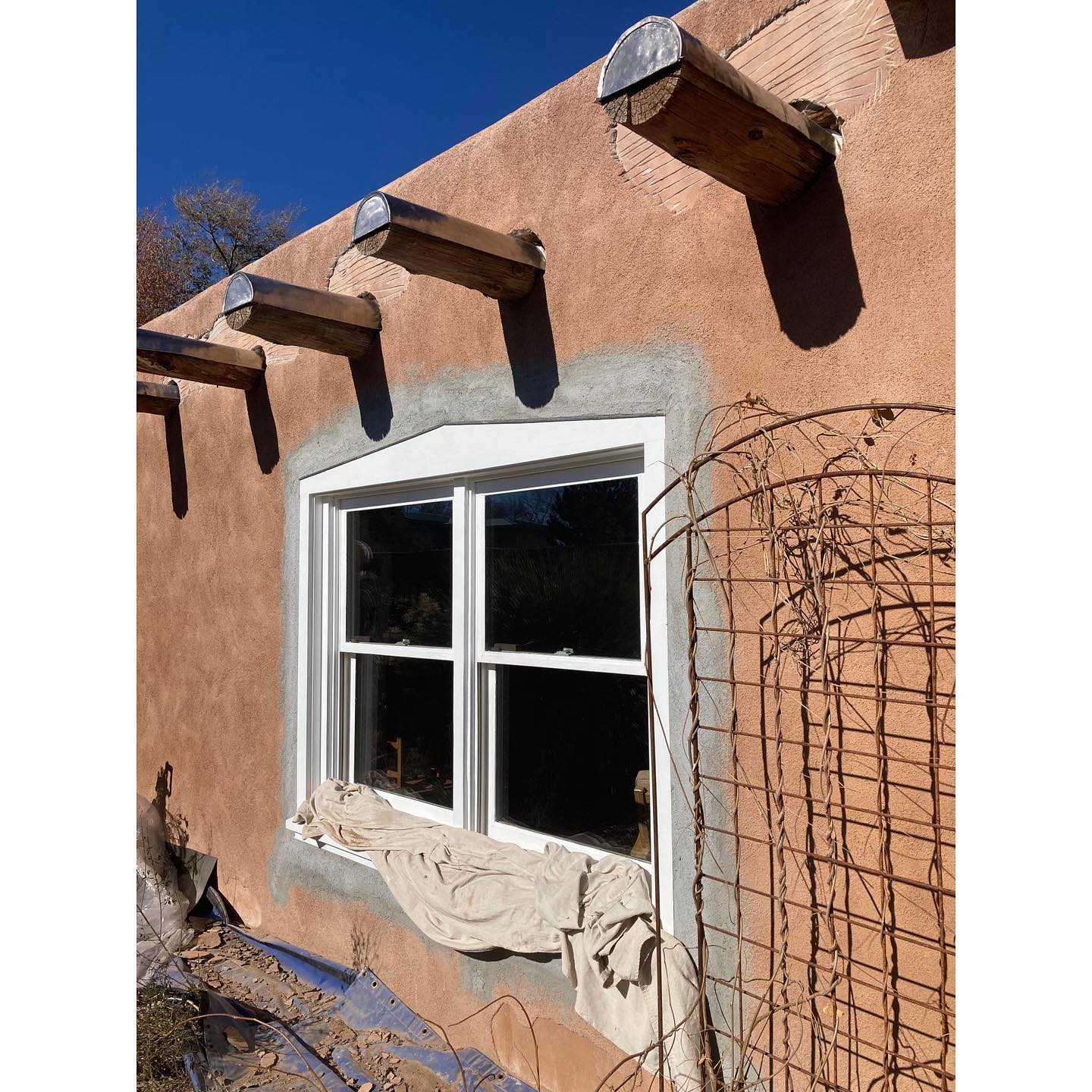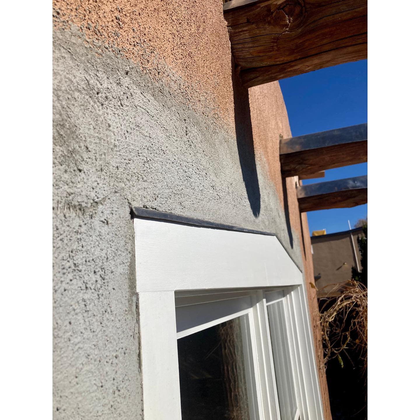 This fall we’re working on a window and viga restoration job. We knew the windows were in bad shape, and soon discovered all of the trim, sills, and bottom parts of the window frames were badly rotted. These are all wood windows from the 90’s, poorly built in the first place and made with finger jointed pine, which is okay in vertical applications but not such a good idea for horizontal surfaces. The windows were built to look like traditional wood windows, but the manufacturer used the same material and assembly as modern clad windows, just without the cladding. With some good wood and better detailing they could have held up better, but they clearly performed pretty badly as built. Our clients wanted to stick with wood windows. So, instead of throwing these in the dumpster we decided to restore them. We replaced the sills, sill extensions, and all the trim with solid Spanish cedar, a much more rot resistant choice. To conform with all that was not straight or parallel, we used lead for the head flashing. Lead was our material of choice here because it allowed us to custom fit the metal in place. We’re also using lead for the viga restoration portion of this job. The 1970’s adobe addition on this house was done the old school way, with vigas protruding from the building. When the windows were installed in the 90’s, someone did try to protect the vigas by adding sheet metal and a bunch of silicone. This didn’t really stop the water from coming in, but only trapped it and accelerated the damage. We’re splicing new wood in to replace the rotted parts of the vigas where they protrude, and are treating everything with borate to deter bugs. Unlike the previous sheet metal caps, the new lead flashing goes behind the stucco. We’ve done a number of projects at this beautiful adobe home, including the blue doors that you might recognize. While we’re more in our element with new adobe construction, it is a privilege to do restoration work on buildings like this one, and we appreciate the owners who want to take such thoughtful care of it. #adobehouse #leadflashing #windowrepair #vigas