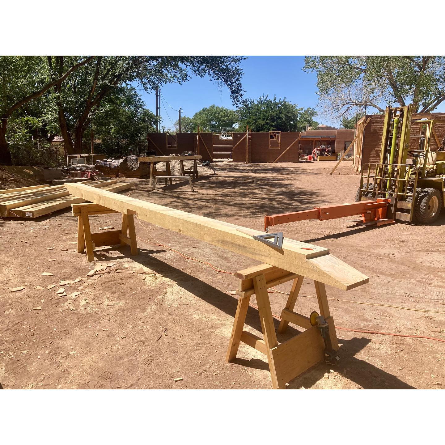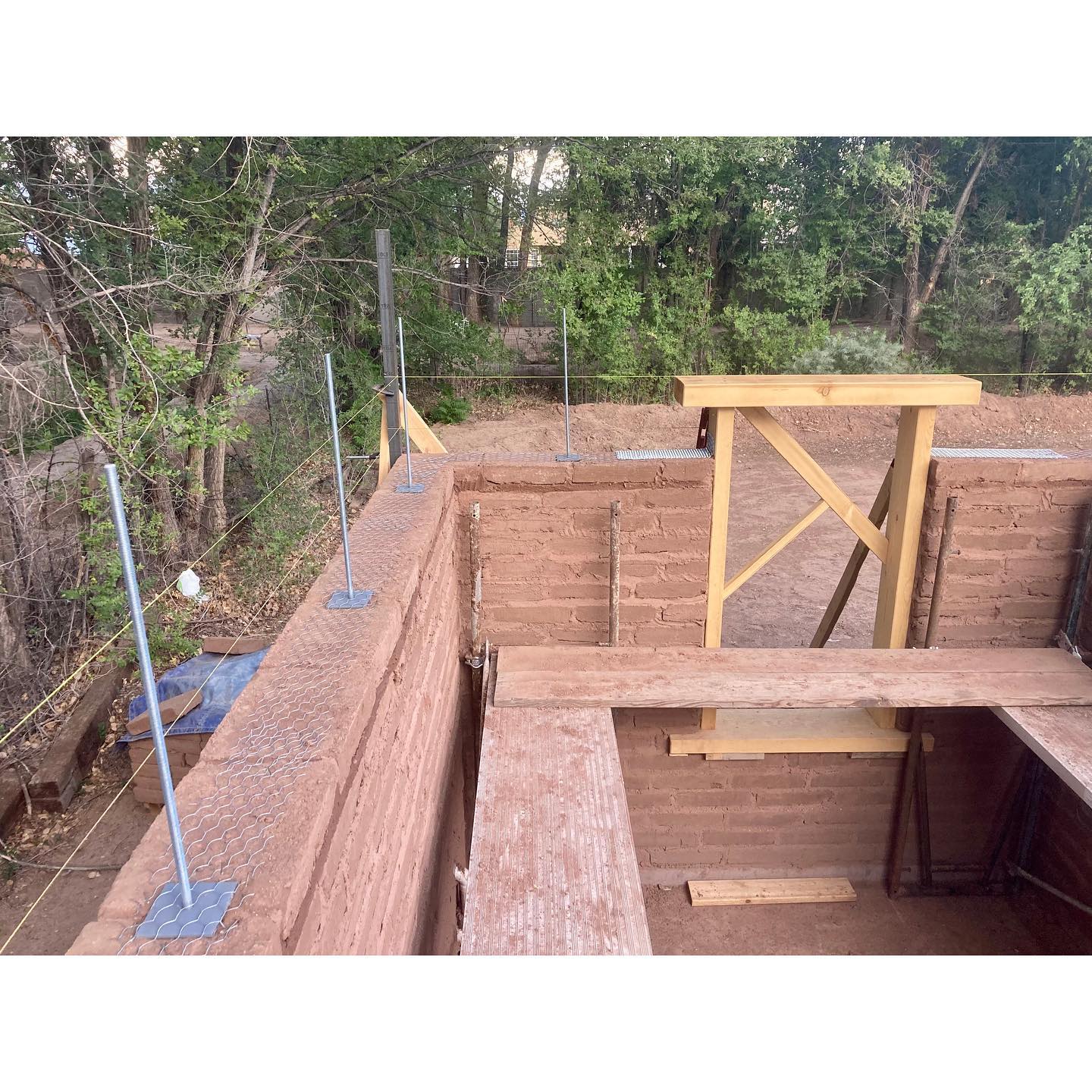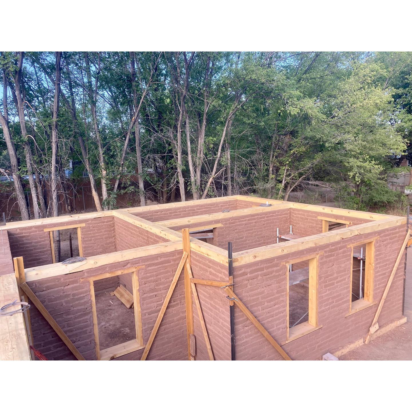 We’ve now arrived at what always feels like a big milestone in the construction of an adobe home: the completion of the bond beam. For this project, we decided to build the bond beam using solid 6×10 beams. In terms of construction, there are advantages and disadvantages… but aesthetically it felt right for this house, which features a lot of woodwork. Early on in the design process we decided to keep the bond beam exposed inside. In the past, the construction of this type of bond beam was much simpler than what we found ourselves tasked with this time. People have been putting bond beams on adobe walls for a long time now, and usually they would just sit there. Whether of concrete, or solid or built-up layers of lumber, they would basically depend on gravity to hold them down. The beam itself weighs quite a bit, and once you stack some more adobe and a roof structure on top of it, you could be pretty confident that that sucker wasn’t going to walk off on you. Prior to modern codes, people would also sometimes build adobe buildings without bond beams. Vigas might just get set straight onto the wall, or maybe there’d be a layer of thinner sections of wood to help spread the load of the roof members a bit. A couple 1×4’s clearly do not qualify as a beam, though, and they’re definitely not doing any “bonding.” Most people today would intuitively regard this as substandard construction… even if you find yourself arguing with a building that’s been standing there for a couple hundred years. The NM Earthen Building Code somewhat vaguely prescribes a 6×10 bond beam, allowing it to be either concrete, or built-up or solid wood that is “fully nailed” (whatever that means). The beam is essentially just sitting there, held by friction and gravity, but the thing is substantial. We’ve permitted and built many structures this way. This time, the City of Albuquerque Planning Department was skeptical (despite approving this very assembly for us just a couple months before), and required us to get an engineer’s stamp. For the end laps, our engineer specified a 12” lap with ½” through bolts. The corner laps (where a nut would be inaccessible) were fastened with ⅜” GRK structural screws. He also wanted to see it tied to the wall somehow. To keep the aesthetic details of the exposed wood, we threaded the bond beam over ½” bolts that went through the top four courses of adobe at roughly 4’ intervals. Since we’d never done something like this before, there was quite a bit of hand wringing leading up to it, but it ended up going smoother than expected. And although we believe this goes far beyond what is prescribed in the NM Earthen Building Code, our bond beam is satisfyingly stout AF. If there is ever a major seismic event in Albuquerque, this adobe would certainly fare better than most. #adobehouse #adobeconstruction #bondbeam #nmearthenbuildingcode #earthenmasonry #adobebondbeam #finehomebuilding #earthbuilding #adobes #cabq #traditionalbuilding #timberframing