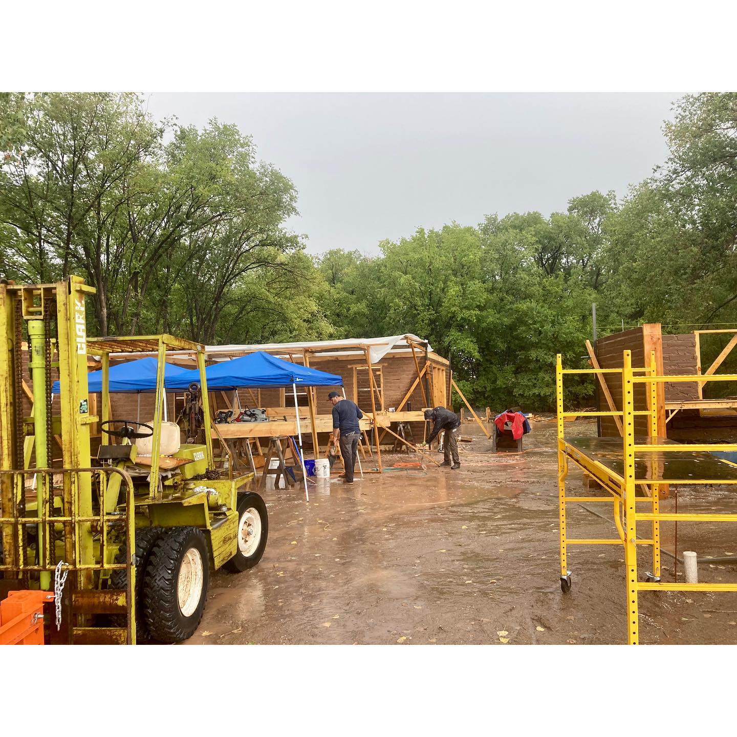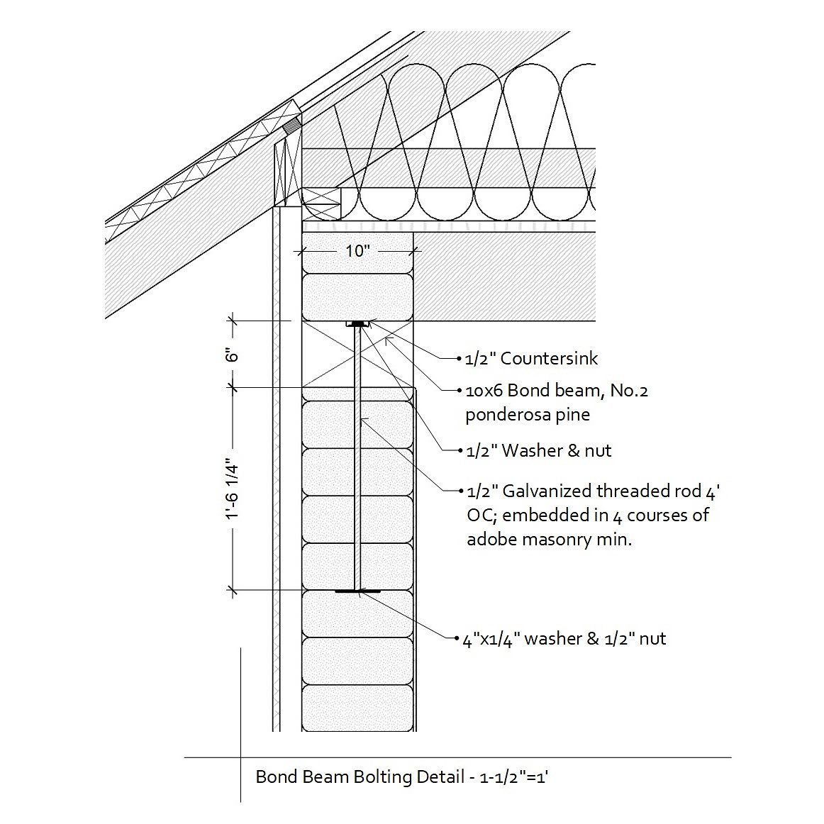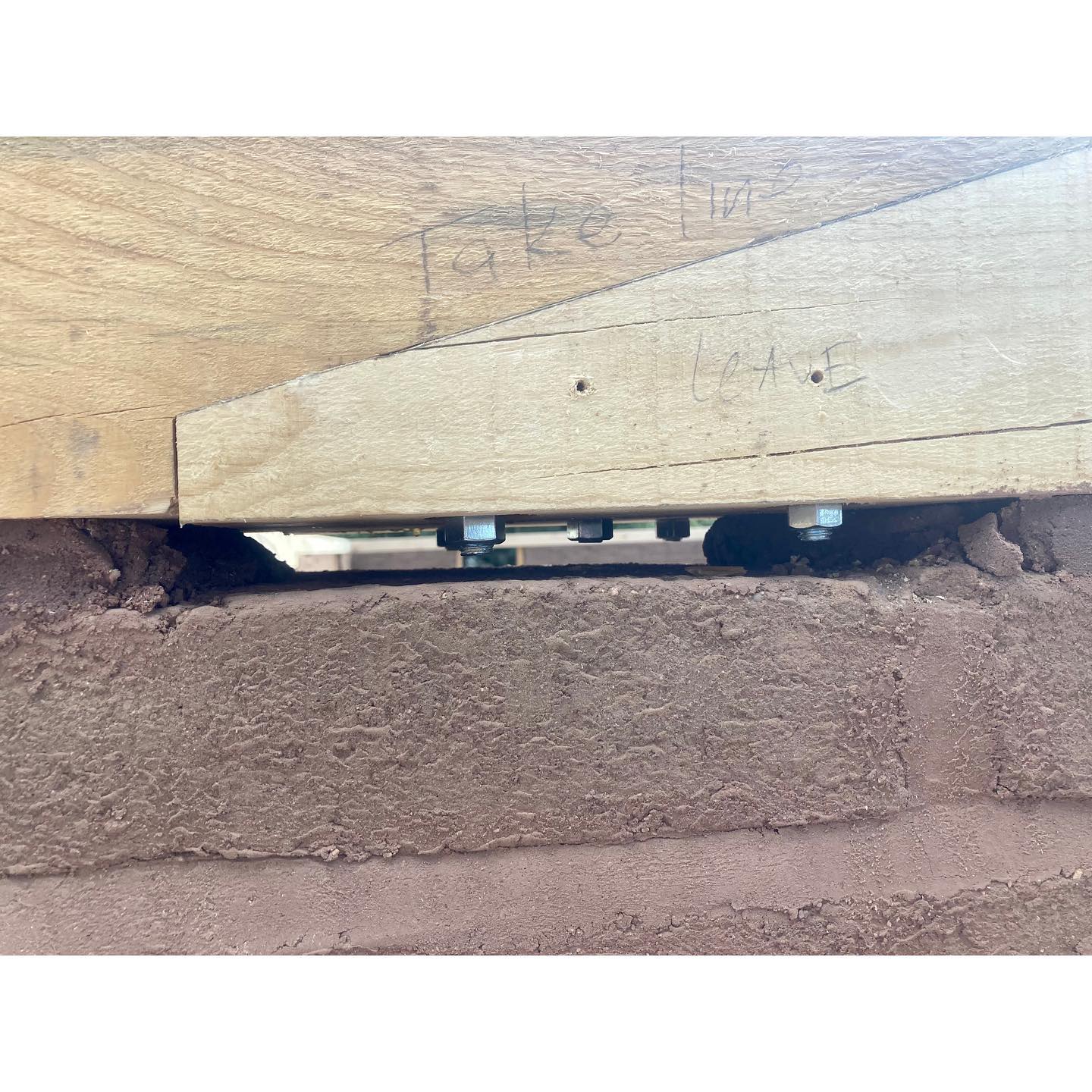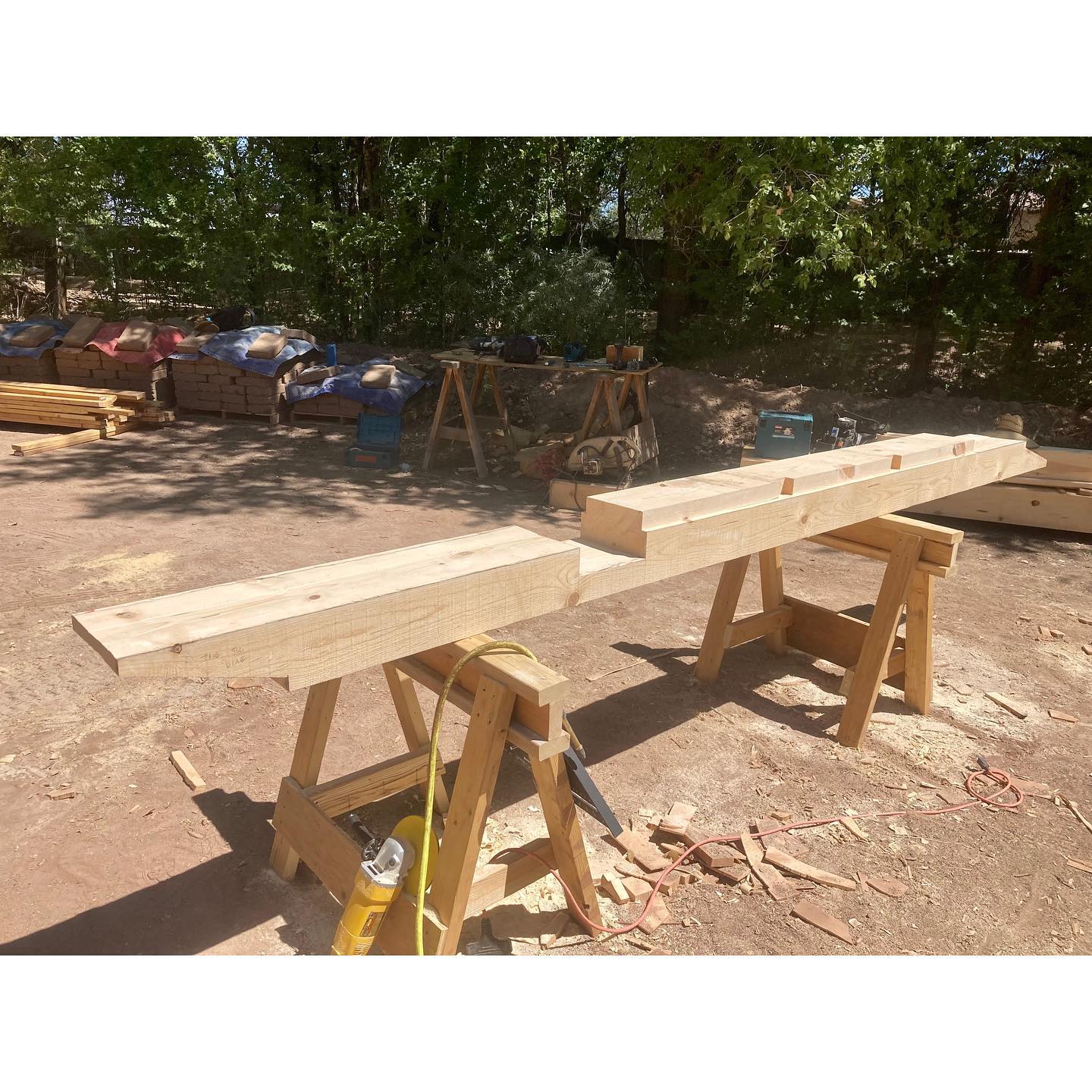 We’ve now arrived at what always feels like a big milestone in the construction of an adobe home: the completion of the bond beam. For this project, we decided to build the bond beam using solid 6×10 beams. In terms of construction, there are advantages and disadvantages… but aesthetically it felt right for this house, which features a lot of woodwork. Early on in the design process we decided to keep the bond beam exposed inside. In the past, the construction of this type of bond beam was much simpler than what we found ourselves tasked with this time. People have been putting bond beams on adobe walls for a long time now, and usually they would just sit there. Whether of concrete, or solid or built-up layers of lumber, they would basically depend on gravity to hold them down. The beam itself weighs quite a bit, and once you stack some more adobe and a roof structure on top of it, you could be pretty confident that that sucker wasn’t going to walk off on you. Prior to modern codes, people would also sometimes build adobe buildings without bond beams. Vigas might just get set straight onto the wall, or maybe there’d be a layer of thinner sections of wood to help spread the load of the roof members a bit. A couple 1×4’s clearly do not qualify as a beam, though, and they’re definitely not doing any “bonding.” Most people today would intuitively regard this as substandard construction… even if you find yourself arguing with a building that’s been standing there for a couple hundred years. The NM Earthen Building Code somewhat vaguely prescribes a 6×10 bond beam, allowing it to be either concrete, or built-up or solid wood that is “fully nailed” (whatever that means). The beam is essentially just sitting there, held by friction and gravity, but the thing is substantial. We’ve permitted and built many structures this way. This time, the City of Albuquerque Planning Department was skeptical (despite approving this very assembly for us just a couple months before), and required us to get an engineer’s stamp. For the end laps, our engineer specified a 12” lap with ½” through bolts. The corner laps (where a nut would be inaccessible) were fastened with ⅜” GRK structural screws. He also wanted to see it tied to the wall somehow. To keep the aesthetic details of the exposed wood, we threaded the bond beam over ½” bolts that went through the top four courses of adobe at roughly 4’ intervals. Since we’d never done something like this before, there was quite a bit of hand wringing leading up to it, but it ended up going smoother than expected. And although we believe this goes far beyond what is prescribed in the NM Earthen Building Code, our bond beam is satisfyingly stout AF. If there is ever a major seismic event in Albuquerque, this adobe would certainly fare better than most. #adobehouse #adobeconstruction #bondbeam #nmearthenbuildingcode #earthenmasonry #adobebondbeam #finehomebuilding #earthbuilding #adobes #cabq #traditionalbuilding #timberframing