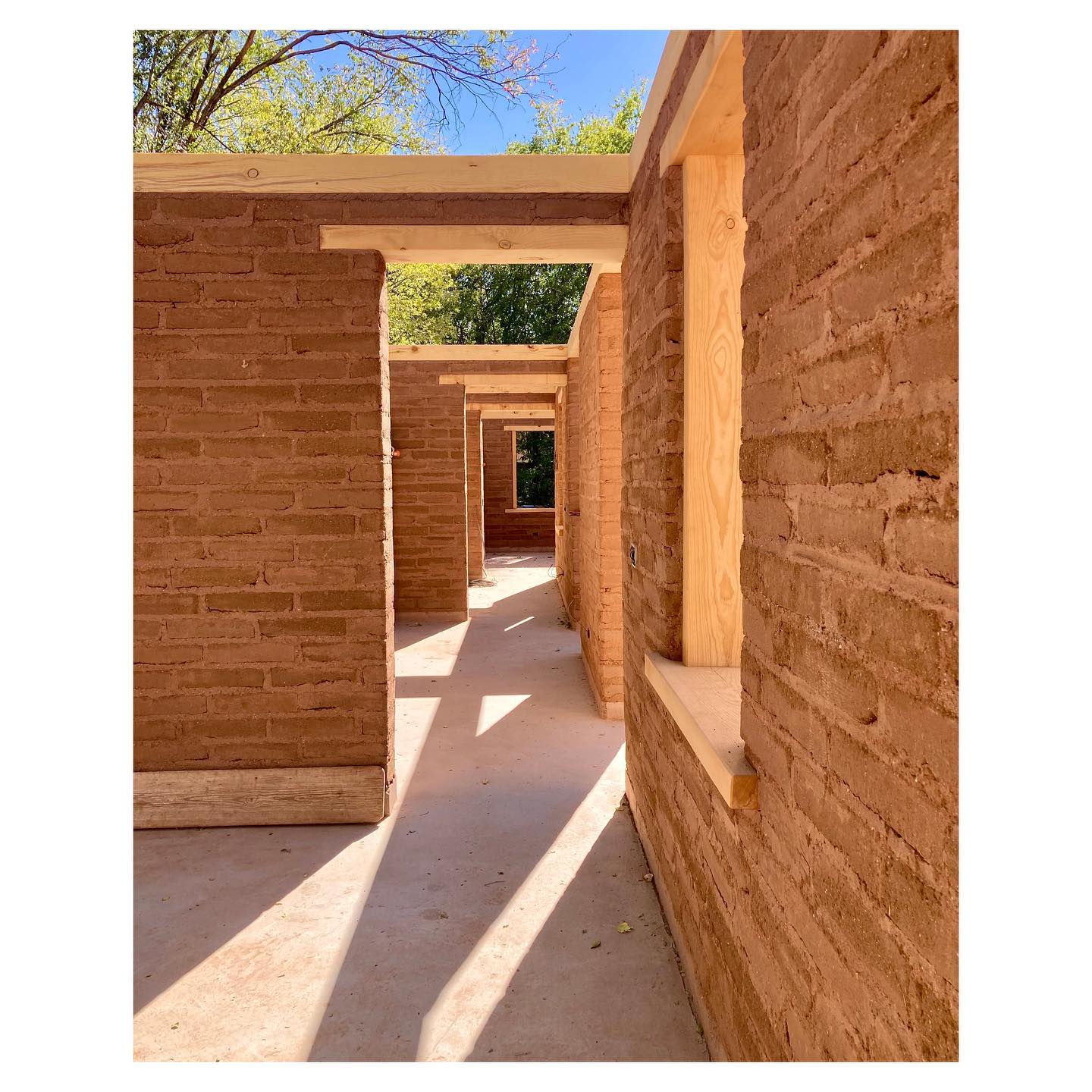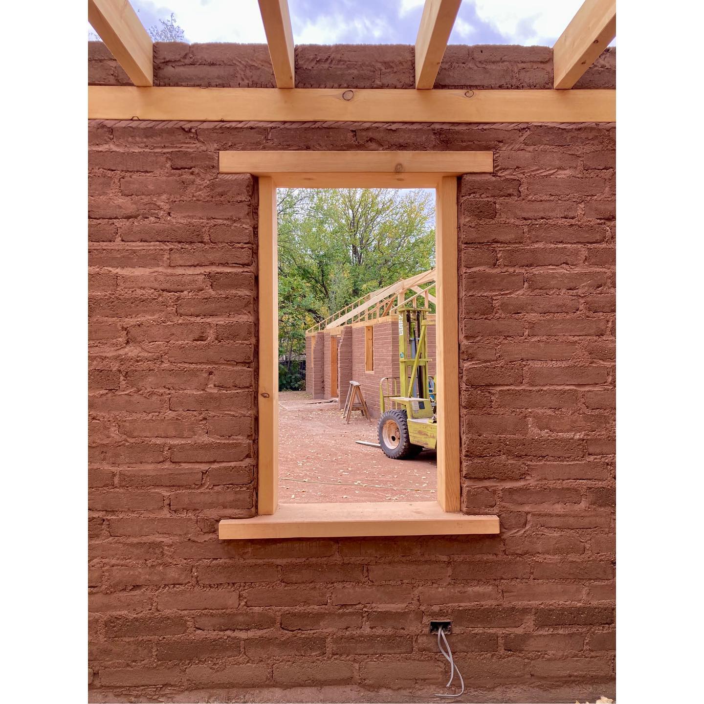 The last adobe for this project was laid yesterday, and we are now well into the carpentry phase. Most of the lumber we are working with is locally cut rough sawn ponderosa from our friends at Wholesale Timber and Viga in Bernalillo. The batch of lumber we received for the ceiling beams was particularly nice, so we’re pleased to be able to feature them so prominently. We called for a somewhat unusual lumber dimension on this project. The window bucks, headers, and ceiling joists are all 3x ponderosa pine. Rather than the chunky beams and vigas typical of the pueblo revival style, we looked to northern New Mexico for inspiration, particularly the historic pitched roofed adobes you find in the Las Vegas area. Since we’re a good way into putting up rafters, beams and joists, now may be a good time to say a little bit about how we go about that work. Everybody in construction is conversant in the ‘on-center’ way of laying out framing members. In adobe buildings, anytime we’re dealing with plywood or sheetrock, we use that same language, and all the framing members get laid out such that their centers will play nicely with 8′ and 12′ sheet goods. Anytime we’re building a wood ceiling, though, we use an entirely different approach. In its own little way, this is a nice break from the modular strictures of modern construction. The drawing for an adobe home might say, maybe 6×10 36″ O.C., but we interpret that as a maximum–not as a literal rule that must be followed. For each individual space in a building, the beams are laid out to evenly divide the space. So, for example, on our current project we’ve got 36″ spaces, 25 1/2″ spaces, just to name a few. We never use centers; the spaces are what count. The oddball measurements are just fine. Since we’re not using any sort of ‘standard’ covering over this, any dimension can work. What’s more important is how the beams fit into their room. Depending on the floorplan, this can be quite a tricky operation, especially when a single beam might span more than one room, and needs to work well in both of them. There are several rules we follow when doing this, but the desired result is just that everything be obviously intentional–no awkward placements right up against an adjoining wall, no vent hoods having to bend around a beam, etc. While figuring out the layout and position of individual pieces, we also take time to evaluate each beam for defects like pitch pockets, wain, weirdly sawn knots, and so on. We also look for particularly beautiful pieces that have that striking grain pattern, pleasing constellations of tight knots or interesting splashes of color. Lesser beams end up in laundry rooms, perhaps a bathroom, and we try to make sure that the best end up over a bed, and in the living room. Each beam gets lovingly ground with a 36 grit disc on a 7″ grinder, hoisted into place, and nailed with 6″ ringshank nails. #adobehouse #timberframing #traditionalbuilding #finehomebuilding #adobeconstruction #roughcutlumber #locallumber #adobe #newmexicotrue #themasonrysociety #ceilingjoists