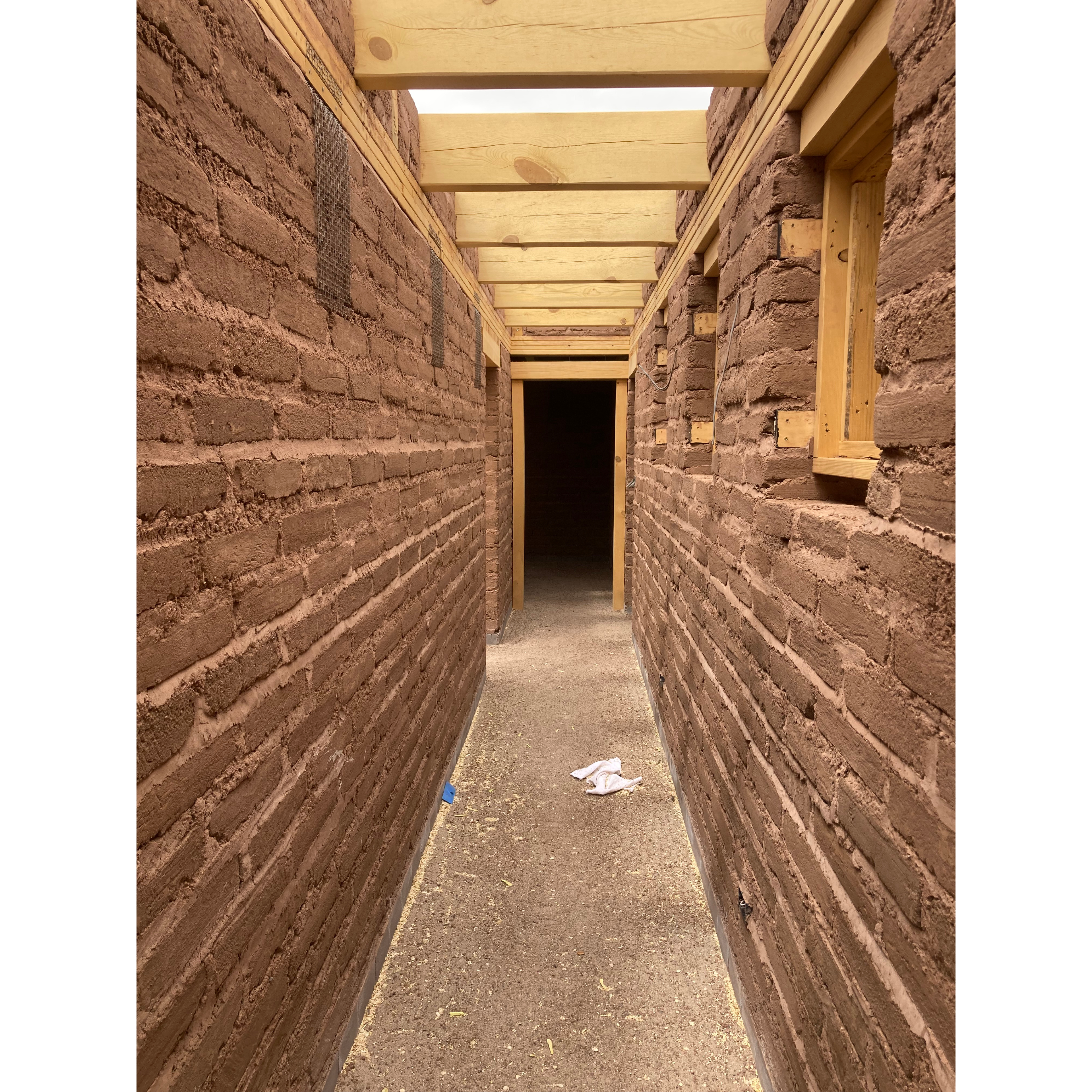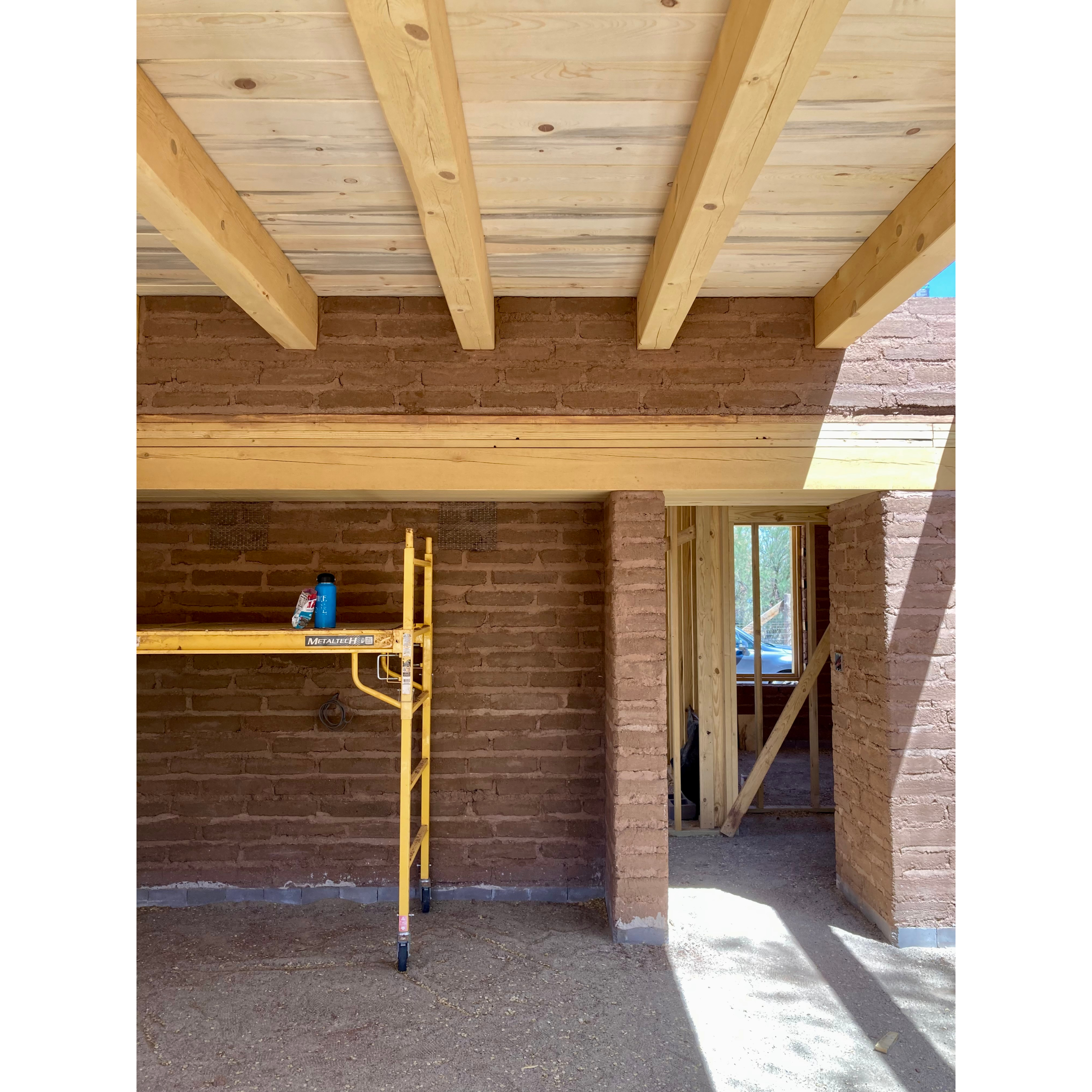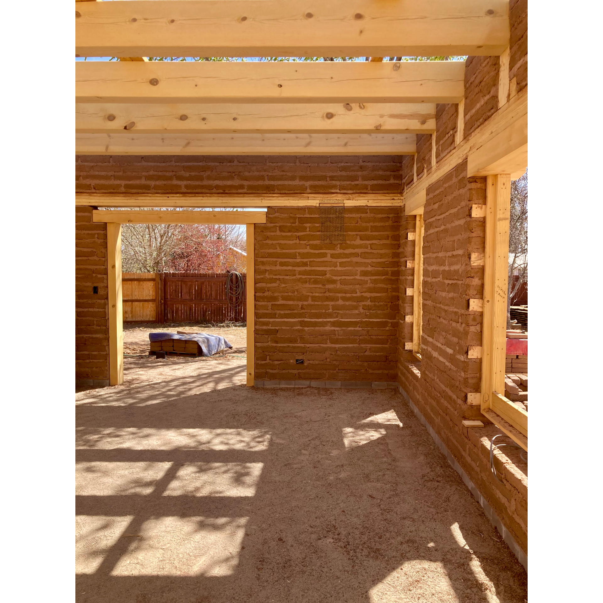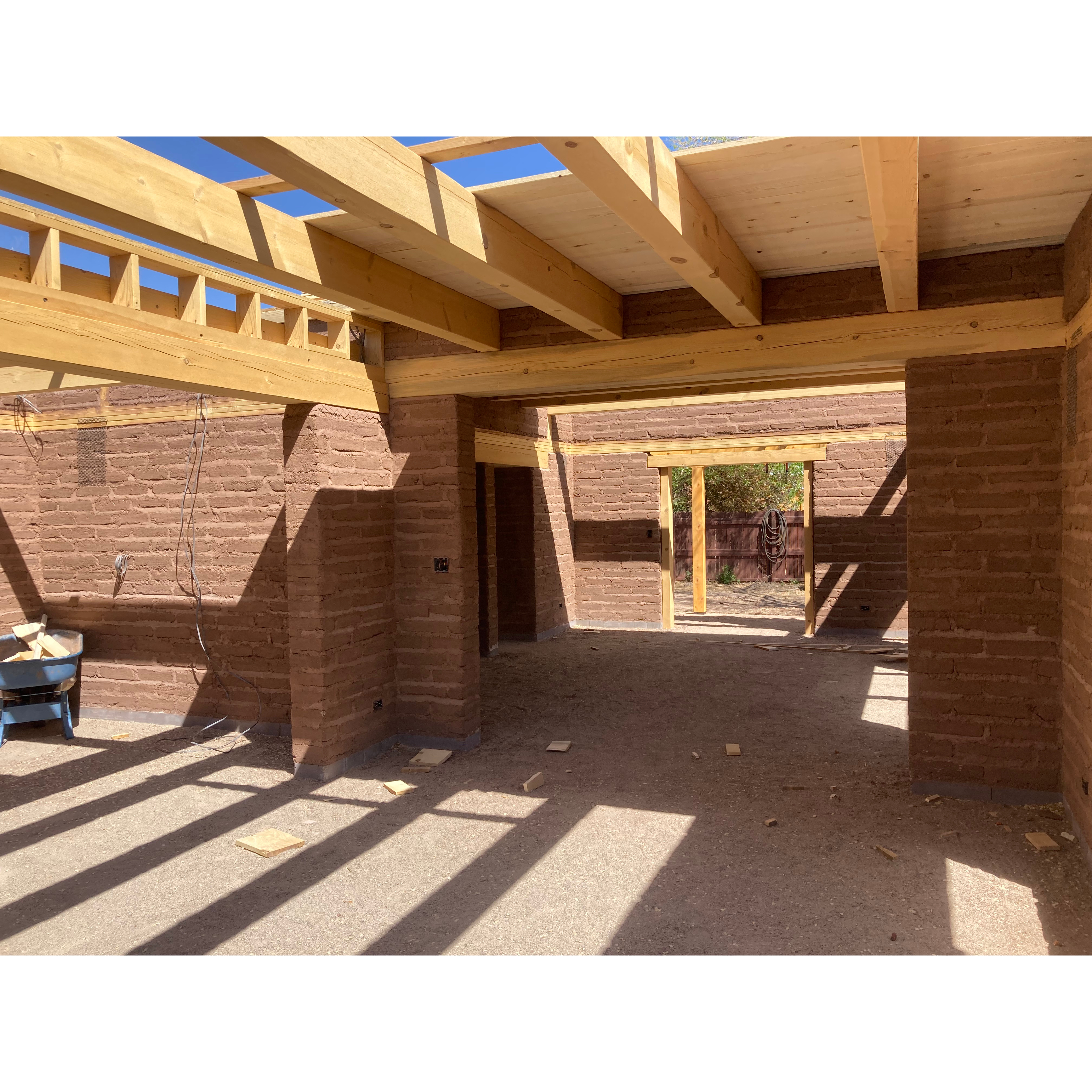 Here’s a bit of what we’ve been up to in the last three months…Ceiling beams, some frame walls, adobe blocking, ceiling decking…