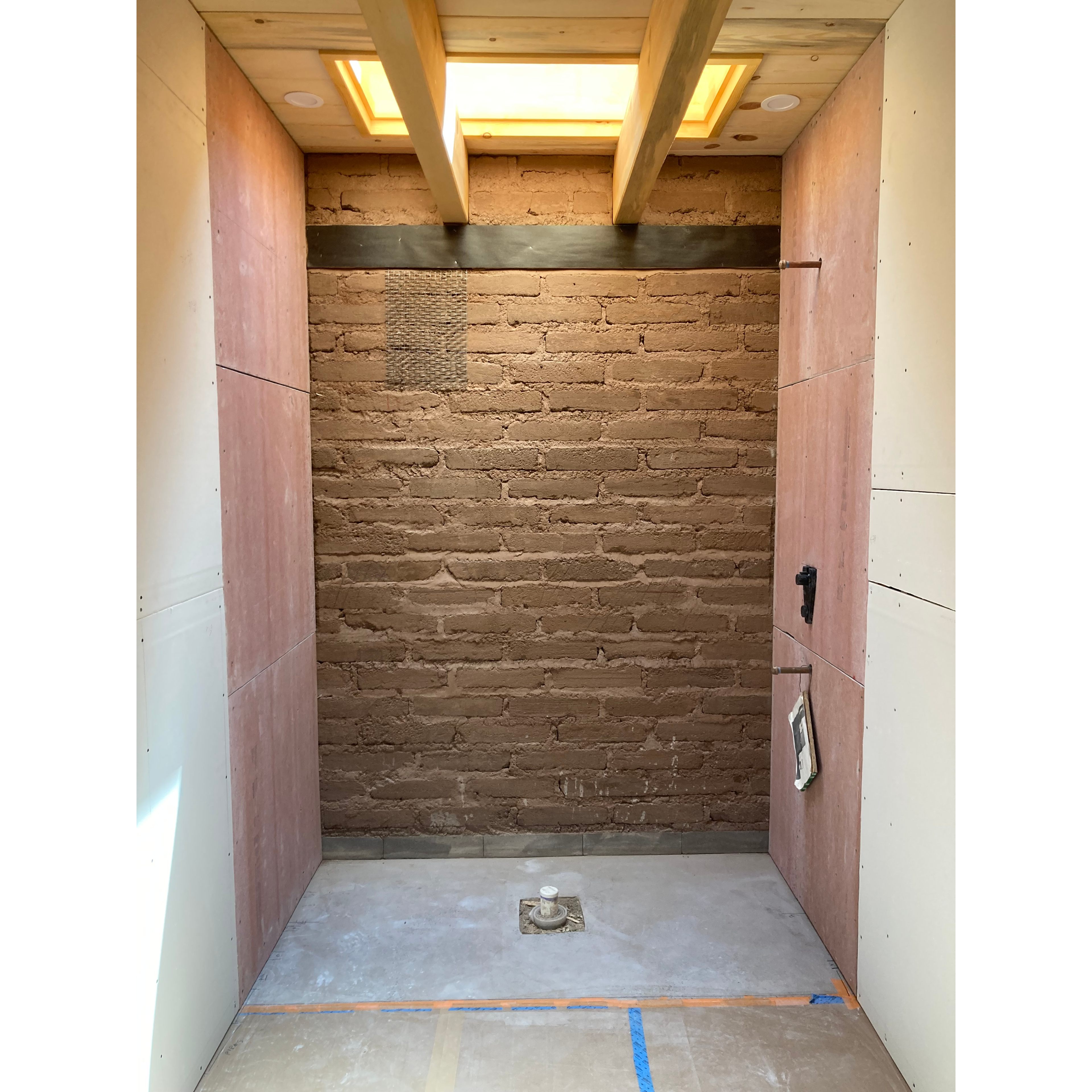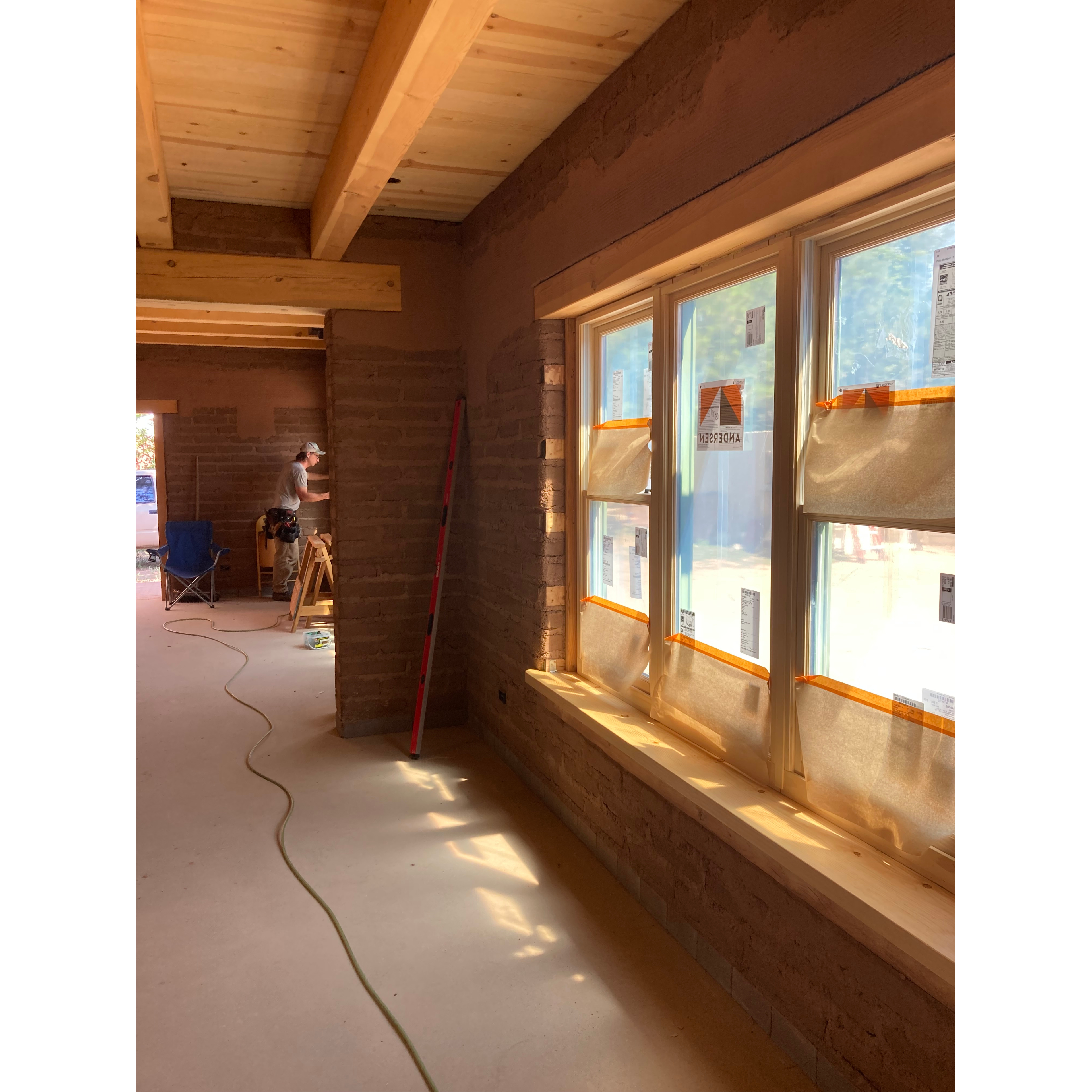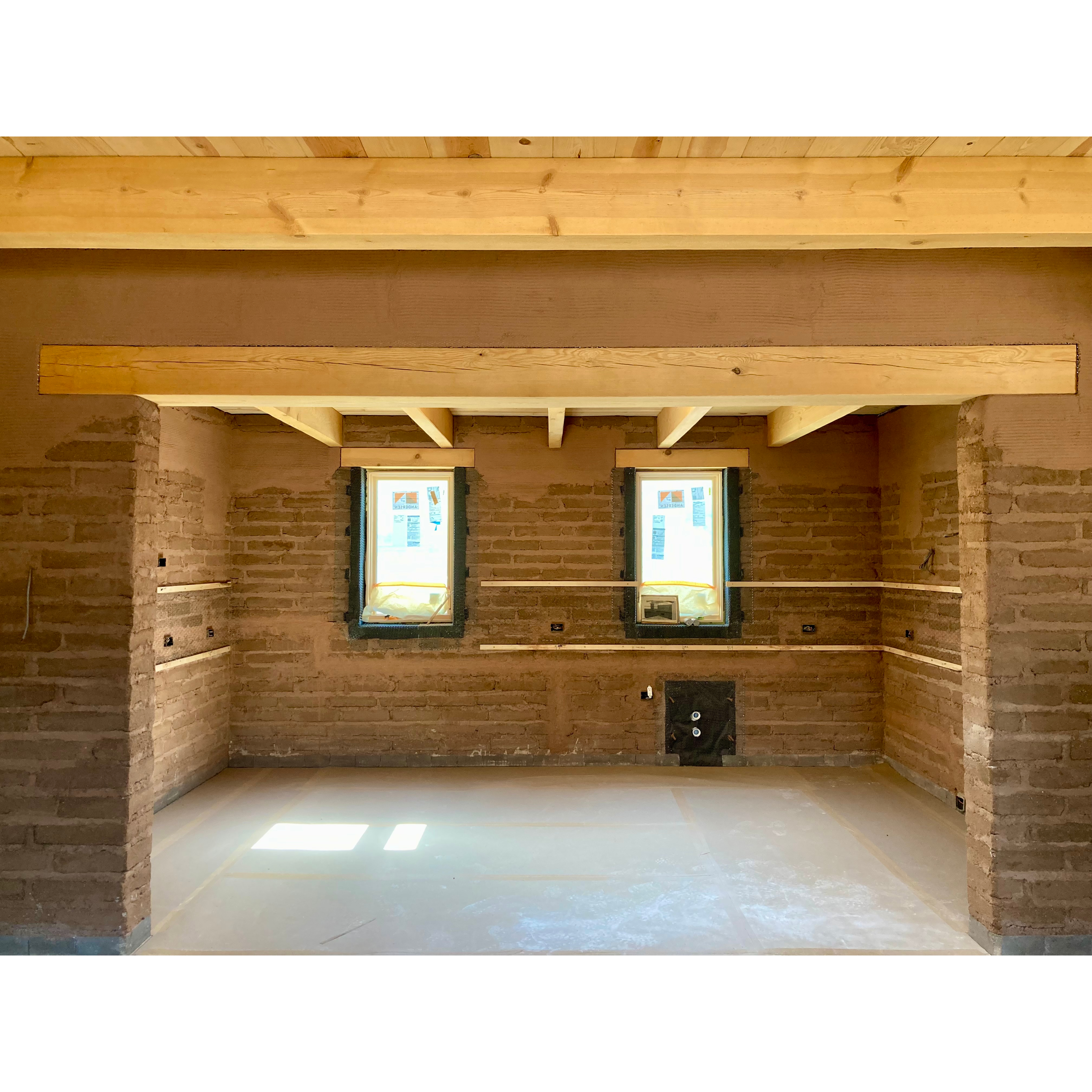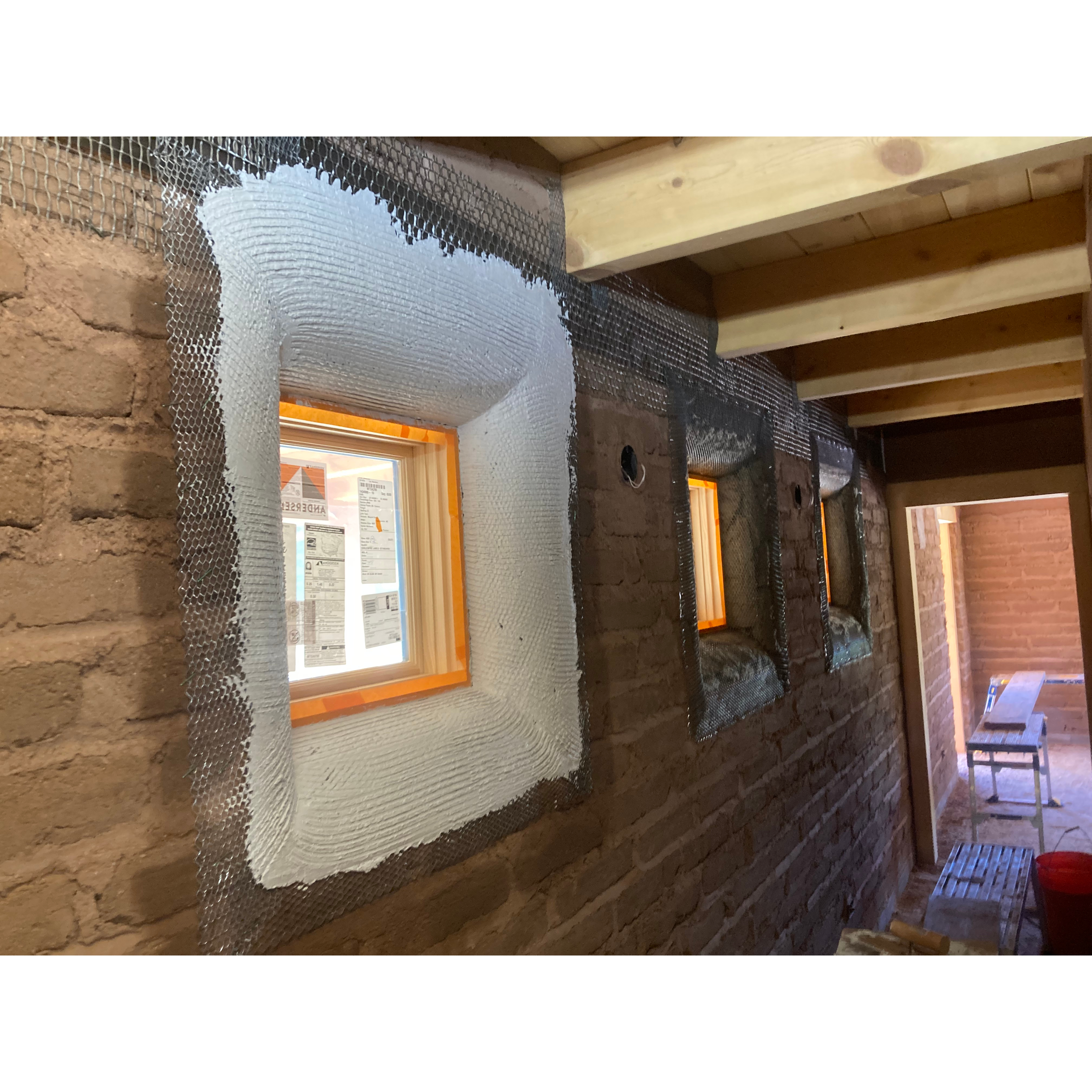 Since then, we’ve installed all the windows, hooked up our electrical service, built the window sills, finished the concrete floors, lathed our bond beam and interior window bullnoses, and got a first coat of plaster over the lath. We’ve also hung all the sheetrock on the interior frame walls. While we don’t have many, we still always go to some length to make our frame walls fit in amongst their superior earthen precedents. They all get mineral wool sound insulation, sheetrock, and earthen plaster.
