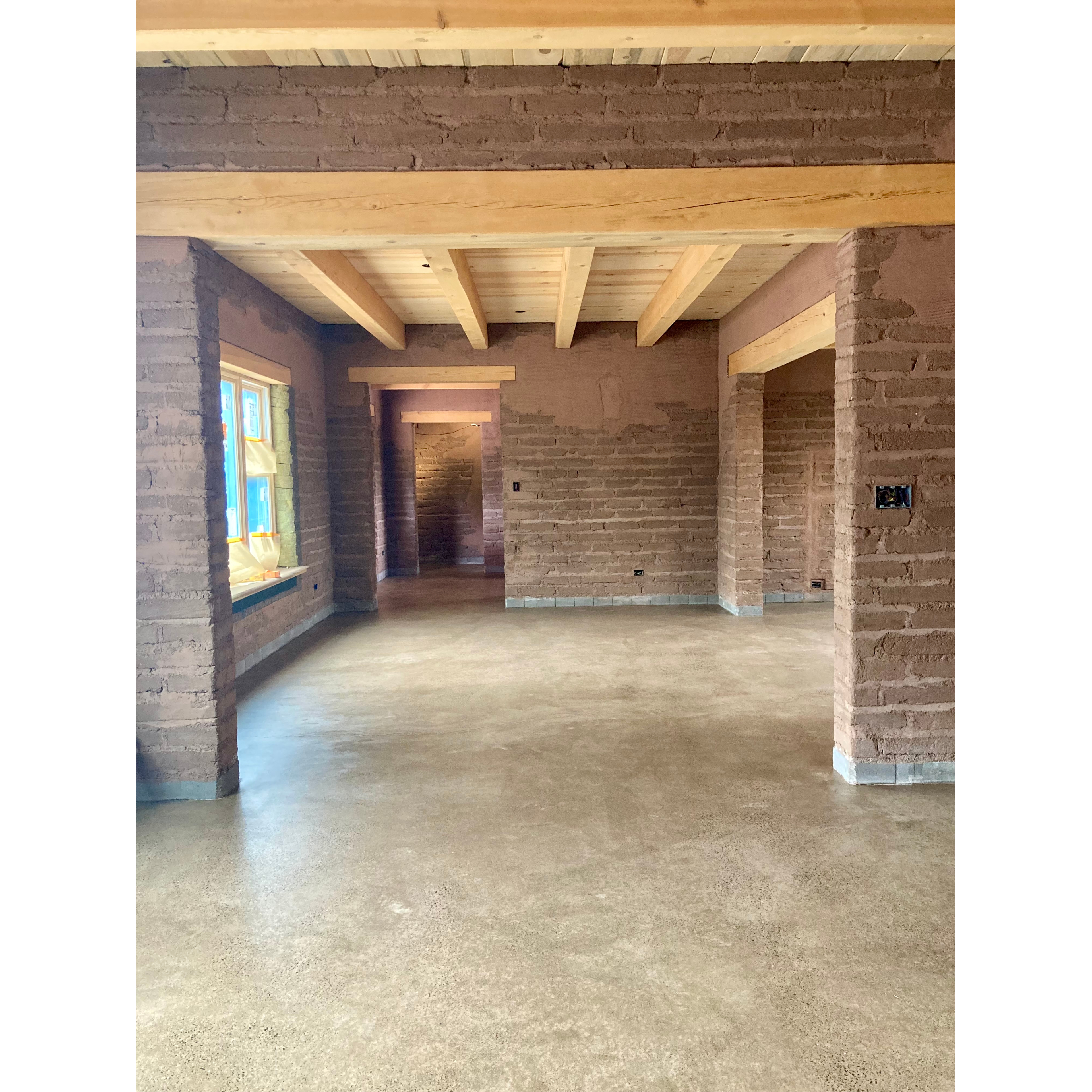 Our work in recent weeks has been inside the house, though we’re not quite finished with the exterior. Like other “flat” roofed adobes we’ve built, we framed the parapets on this house rather than build them of adobe. To tastefully disguise our work, we cut a curve into the parapet studs to mimic a battered back adobe masonry. In our heart of hearts we would love to keep laying adobe all the way up, but the framed parapet just makes too much sense with modern construction requirements. For this assembly, we built what is known as a pocket roof. After the beams are put, the ceiling decking is laid, and a roof framed on top of that. This can be a particularly stressful part of the project, as the beams and ceiling (interior, finished parts of the house) are exposed to the weather until we get a roof deck on. (Needless to say, we’re glad that’s over!!) We had 18-23” of insulation blown into our pocket roof, bringing us to R-60+, and decked the roof right behind the insulation crew. A tar and gravel roof followed. We’re particularly pleased with how we were able to both leave ample space for insulation, and keep the parapets as short as possible. With so many beautiful old adobe homes in the neighborhood, we want nothing more than to feel that our work belongs. As Kate and D.N.S. wrote, “An adobe house should be low and long and close to the earth.”