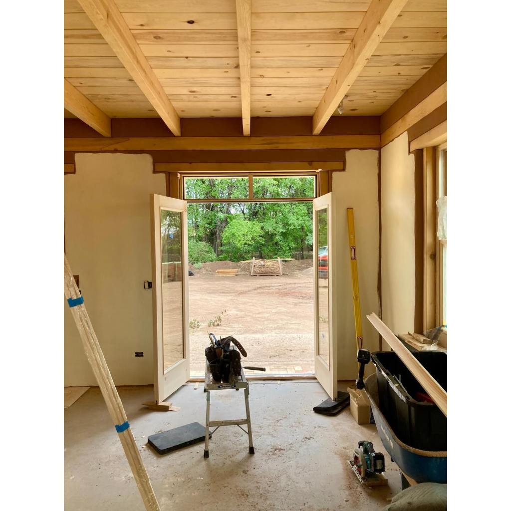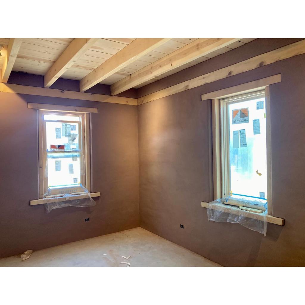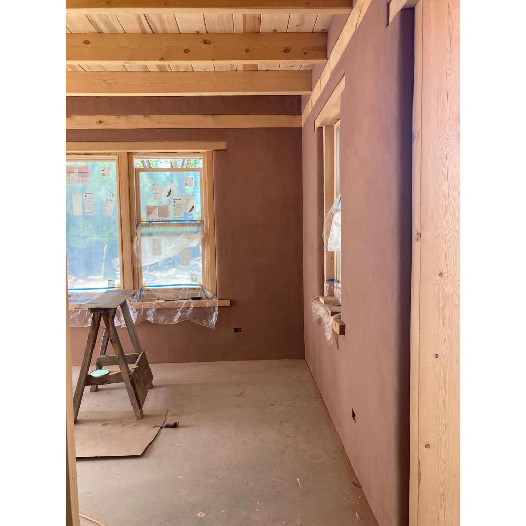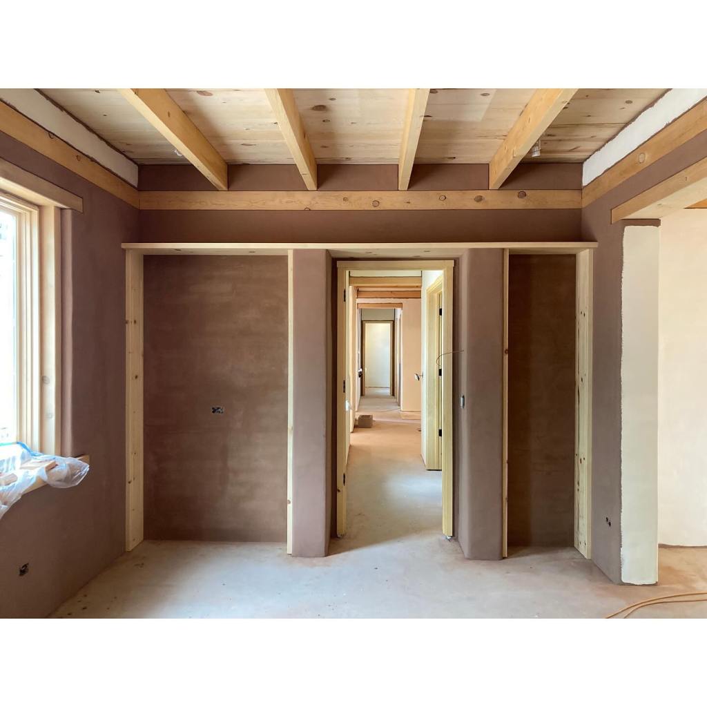It’s been a few months since we’ve had a proper update. On site, our talented guys — Nathan Demar, Erik Navarro, and Sławomir Szumanski — have been hard at work plastering the interiors. Our plaster of choice is a homemade earthen plaster. In this case, we purchased the dirt from our adobe supplier – New Mexico Earth Adobes – screened it, and added sand. We always do several tests first to dial in the recipe, but the New Mexico Earth dirt, being the most finely curated raw earth this side of the Sandias, didn’t require much fiddling. We use mud plaster for both the adobe walls and the frame walls. The frame walls, after hanging and taping the sheetrock, are simply painted with a standard primer with screened sand in it. We add a bit of wheat paste to the plaster to help it adhere to these smoother surfaces. As beautiful as this raw earth plaster is, it is a little on the dark side for most situations. We’re finishing it with clay paint (keeping those earthen walls breathable and happy), except for the barn which remain its natural color. Meanwhile, Kenny has been at our workshop fabricating all the exterior doors for both buildings. The house needs a front door and double patio doors, both with transoms above. The barn has two large openings for carriage style doors. The opening underneath the portal will receive a double door, but the north facing “garage” door will actually be a triple unit: a pair of bifolds plus a single active door, each secured with slide bolts. These have been fabricated of solid pine, and will be finished with successive coats of penetrating and hard-wax oils to protect them from the sun and keep them looking beautiful. Its feels like we’re in the home stretch, but the to-do list is still long. Doors need to be finished, showers tiled, brick floors laid, closets built, cabinets designed and fabricated, countertop milled up and put together… and if we’re lucky we’ll finish our next house plans and get those submitted this summer, too.