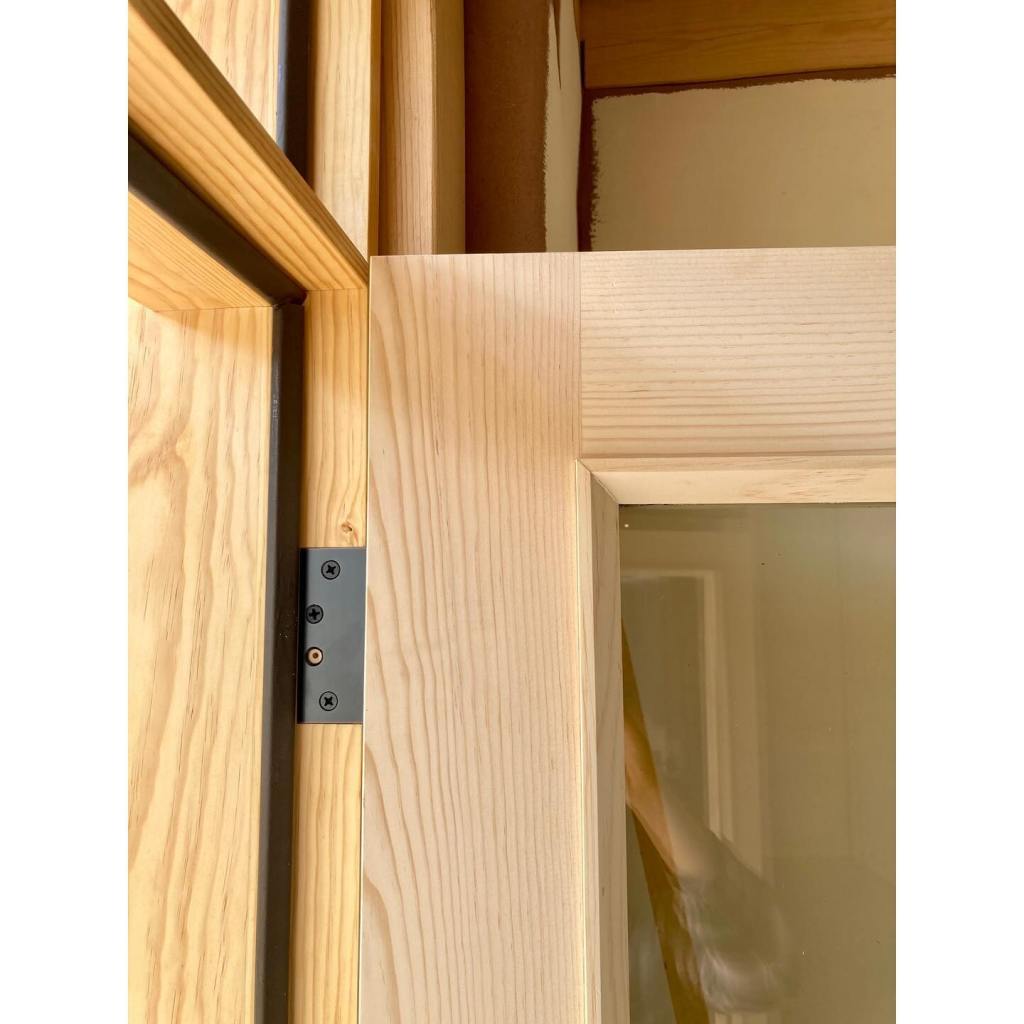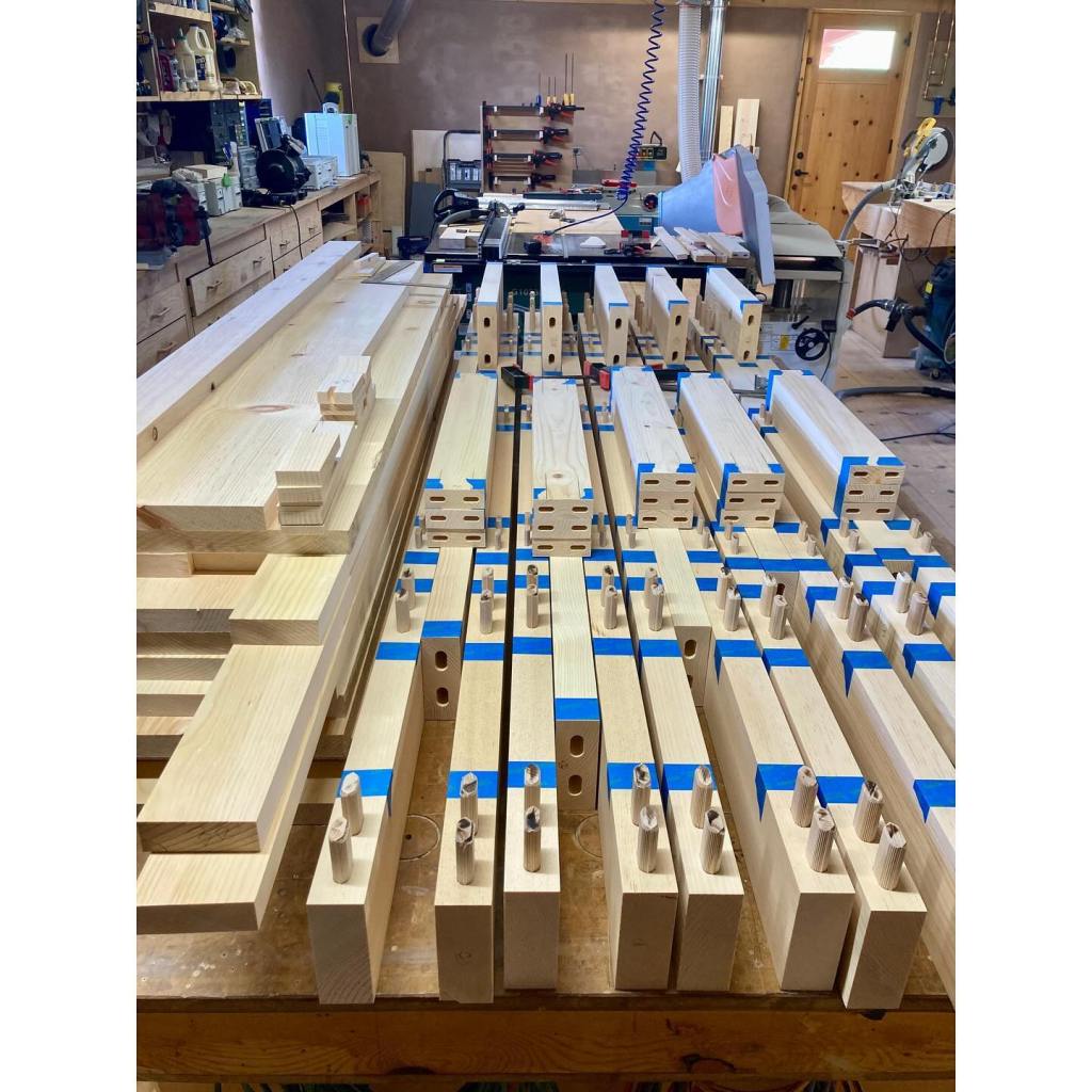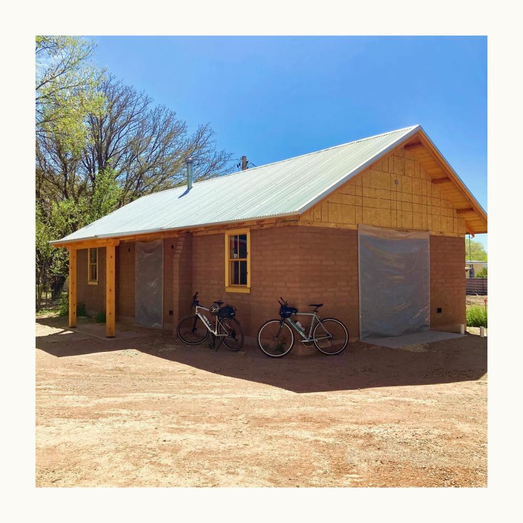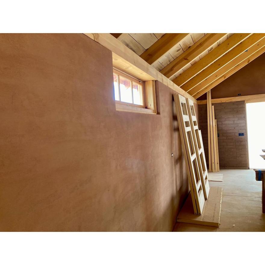 It’s been a few months since we’ve had a proper update. On site, our talented guys — Nathan Demar, Erik Navarro, and Sławomir Szumanski — have been hard at work plastering the interiors. Our plaster of choice is a homemade earthen plaster. In this case, we purchased the dirt from our adobe supplier – New Mexico Earth Adobes – screened it, and added sand. We always do several tests first to dial in the recipe, but the New Mexico Earth dirt, being the most finely curated raw earth this side of the Sandias, didn’t require much fiddling. We use mud plaster for both the adobe walls and the frame walls. The frame walls, after hanging and taping the sheetrock, are simply painted with a standard primer with screened sand in it. We add a bit of wheat paste to the plaster to help it adhere to these smoother surfaces. As beautiful as this raw earth plaster is, it is a little on the dark side for most situations. We’re finishing it with clay paint (keeping those earthen walls breathable and happy), except for the barn which remain its natural color. Meanwhile, Kenny has been at our workshop fabricating all the exterior doors for both buildings. The house needs a front door and double patio doors, both with transoms above. The barn has two large openings for carriage style doors. The opening underneath the portal will receive a double door, but the north facing “garage” door will actually be a triple unit: a pair of bifolds plus a single active door, each secured with slide bolts. These have been fabricated of solid pine, and will be finished with successive coats of penetrating and hard-wax oils to protect them from the sun and keep them looking beautiful. Its feels like we’re in the home stretch, but the to-do list is still long. Doors need to be finished, showers tiled, brick floors laid, closets built, cabinets designed and fabricated, countertop milled up and put together… and if we’re lucky we’ll finish our next house plans and get those submitted this summer, too.