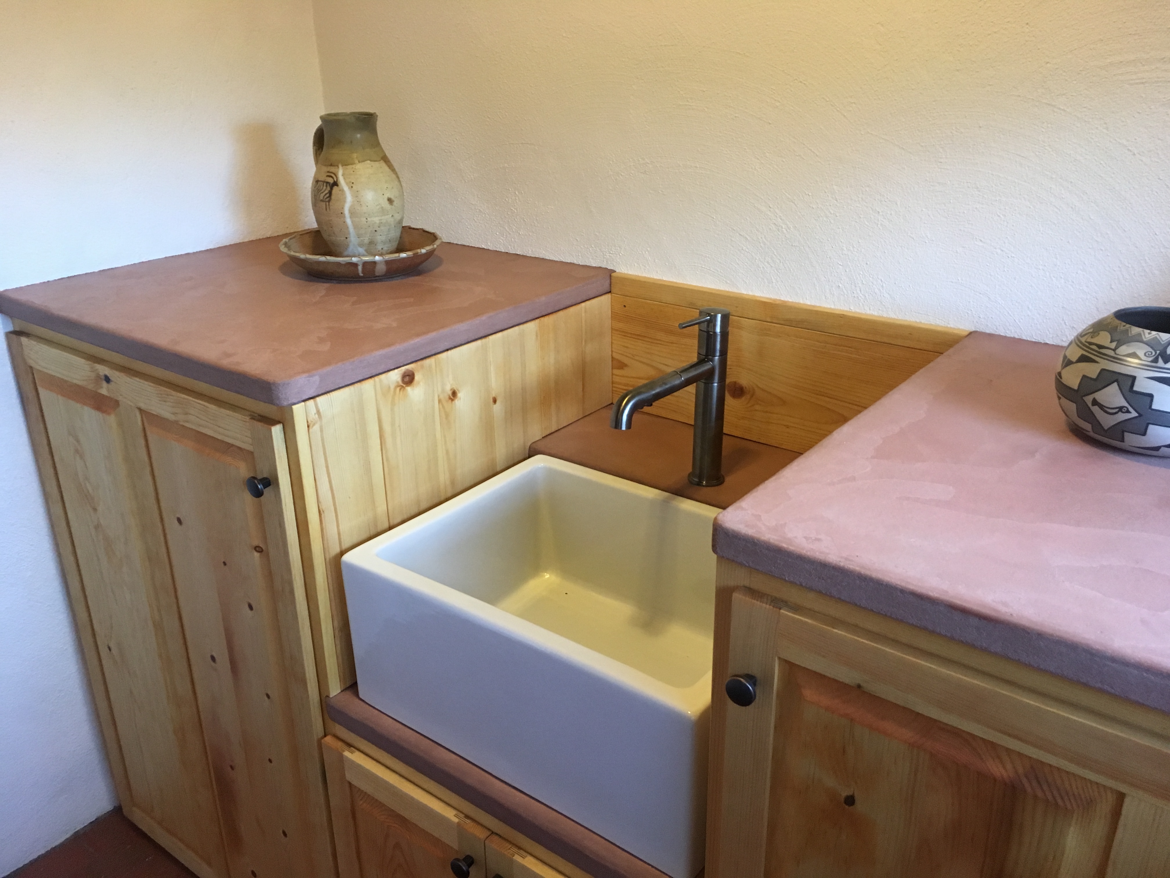 Remodel of study and laundry room in an older adobe house. For the study we used wide plank pine flooring with steel cut restoration nails, and custom fabricated a Spanish cedar and square bar bookshelf. The laundry / pass-through room featured concealed appliances and dry pack countertops. A faux wall was constructed behind the cabinets to give the illusion of counter-depth units. Built in collaboration with Dave Fischer.