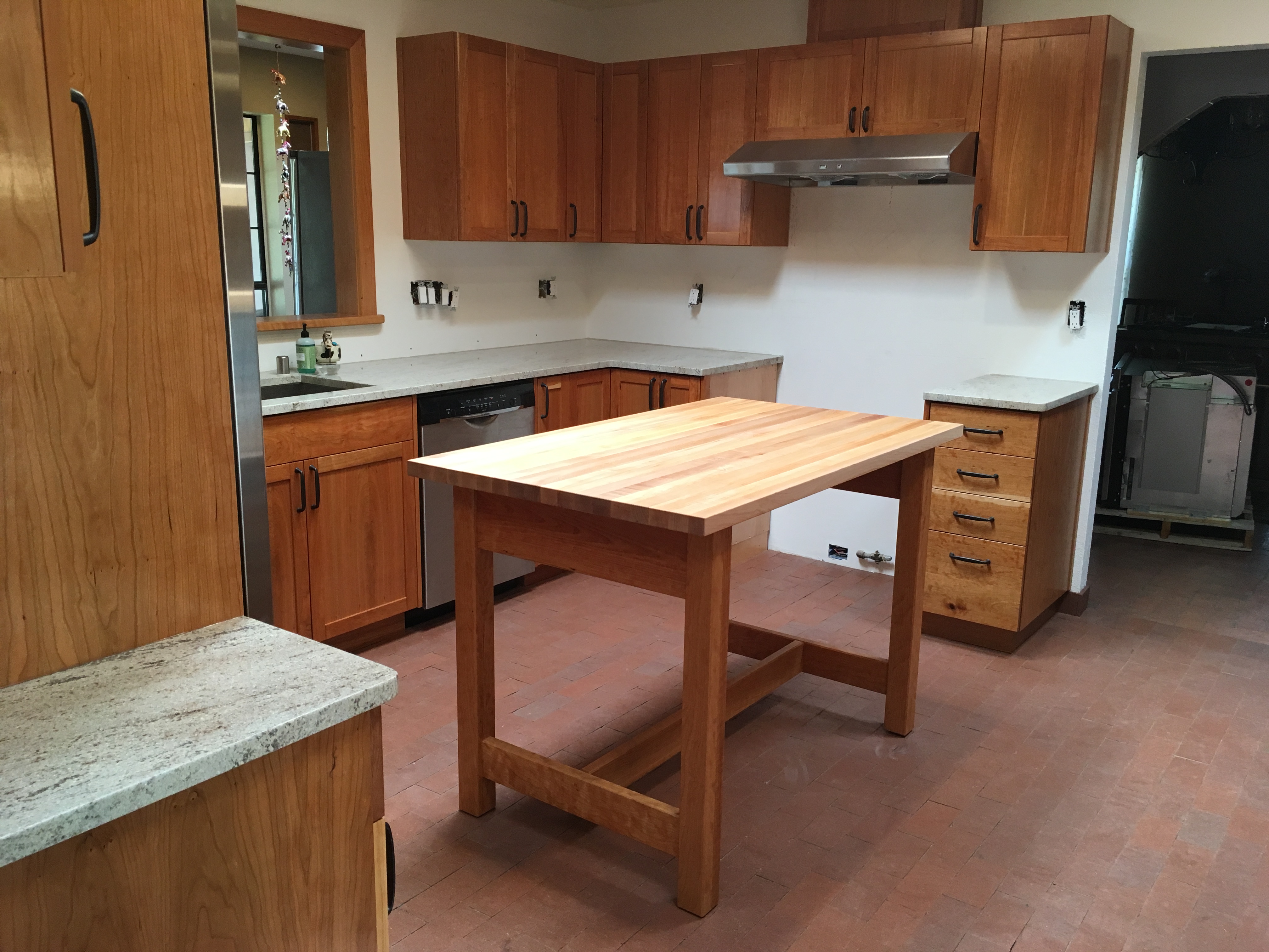 Cherry kitchen cabinets, 2020. Installation included upper and lower cabinets with solid cherry doors, and built-ins for the refrigerator and wall oven. Kitchen also featured a solid cherry island, adobe mud plaster walls, and new window trim. Built in coordination with Win DeLapp.