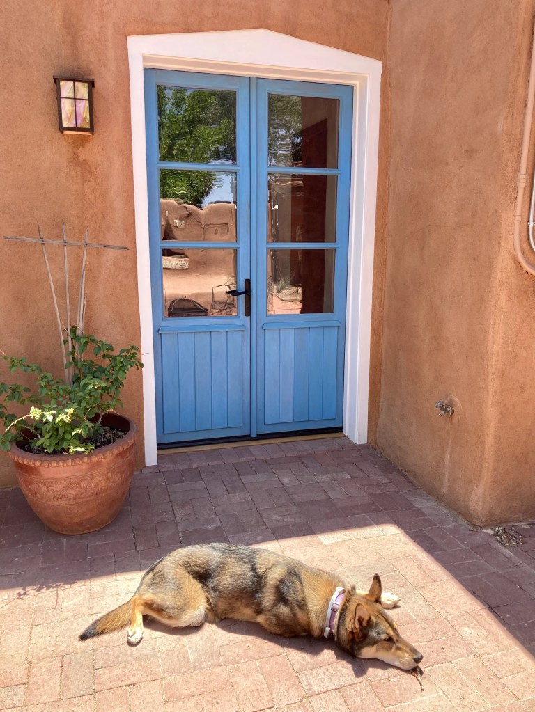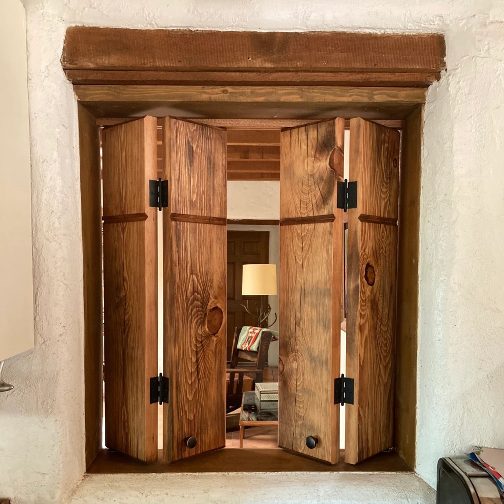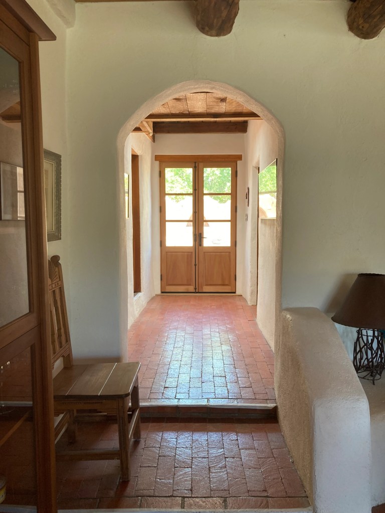 Older adobe house remodel featuring custom built French-inspired doors with multipoint locks and cremone bolt. The original door was just 6′ 4″, off-centered in a dark hallway, and when open partially blocked the doorway next to it. We enlarged the opening, adding a new lintel and relaying the exterior brick. We replaced the old door with 7′ tall narrow stile double doors fabricated in our shop out of African mahogany, with stave core construction for the stiles and true divided lites. Remodel also included rustic privacy shutters for an interior window opening, a faux interior beam, and adjusting the remaining doors throughout the rest of the house.