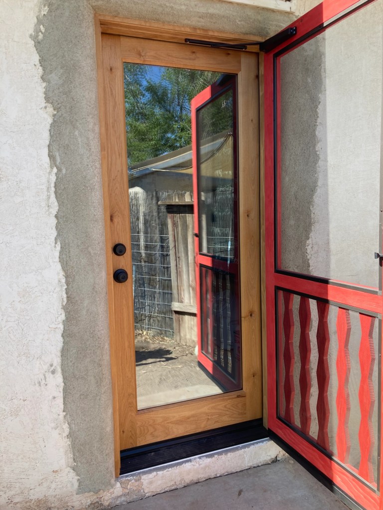 Two pairs of exterior and screen doors we built for a small house in the South Valley undergoing renovations. The exterior doors are solid alder, with an Osmo finish and lots of glazing to bring more natural light into the house. For the screen doors, we went with a traditional New Mexican zig-zag pattern and cherry red stain. The screen doors operate with a hydraulic closer.