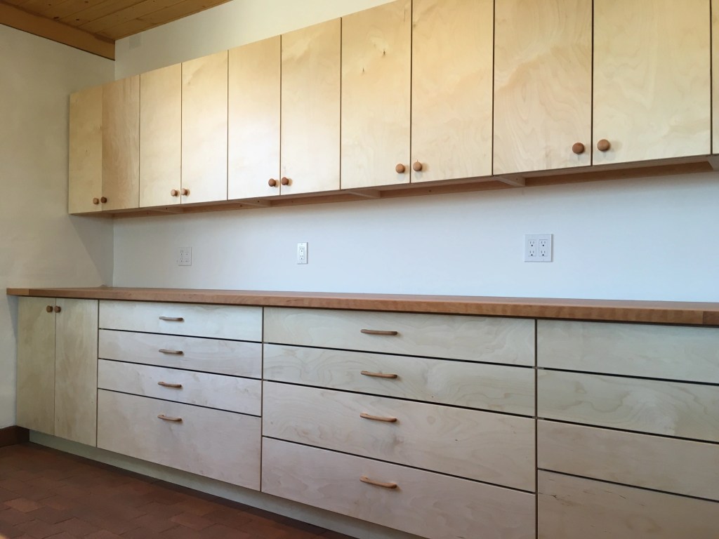 Baltic birch cabinets, including specialty drying cabinet and freestanding workbench, with Pollmeier BauBuche panel tops. Built in coordination with Win DeLapp.